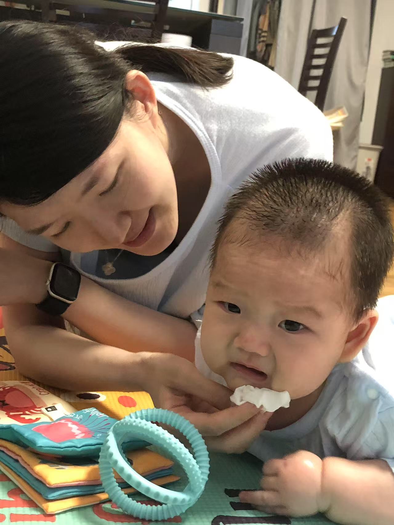 语言方面古诗词,手指谣,儿歌,继续大量输入,听标准音,我们也正常多交流。现在和宝宝说话,宝宝会眼睛注视,很认真的看着我们,时而也会漏出微笑,开心时一逗就乐。