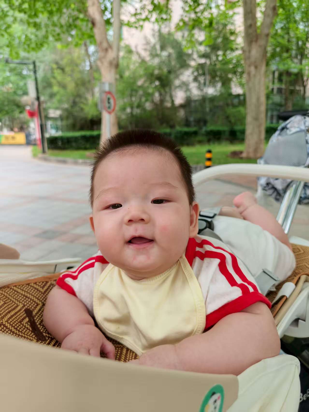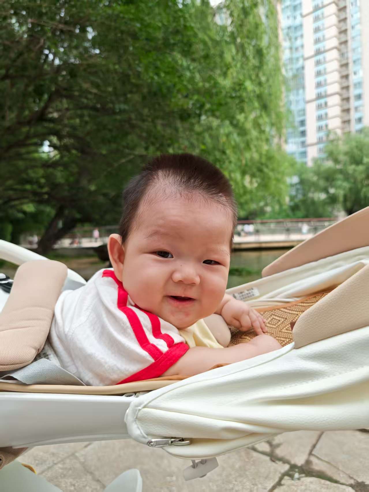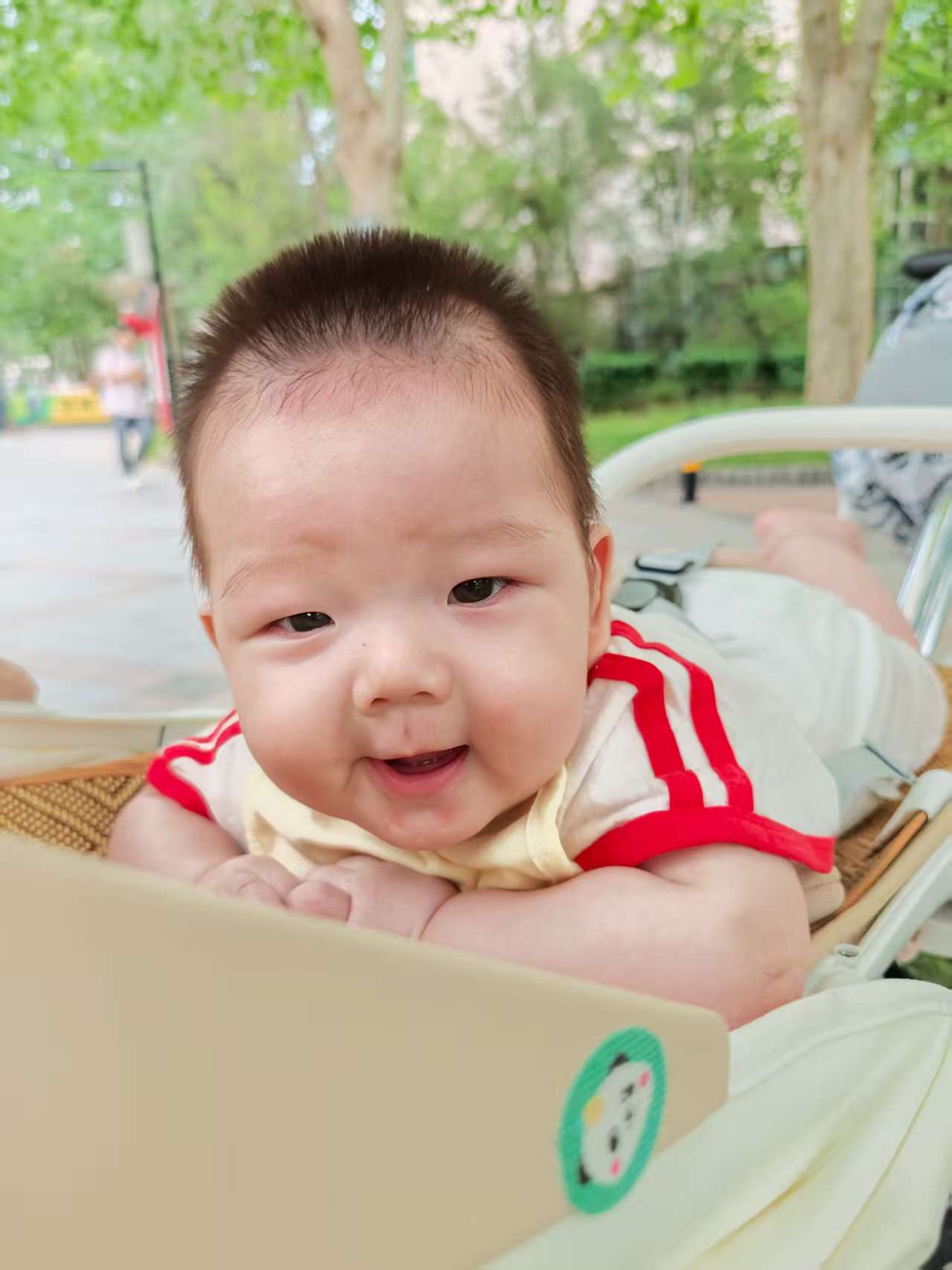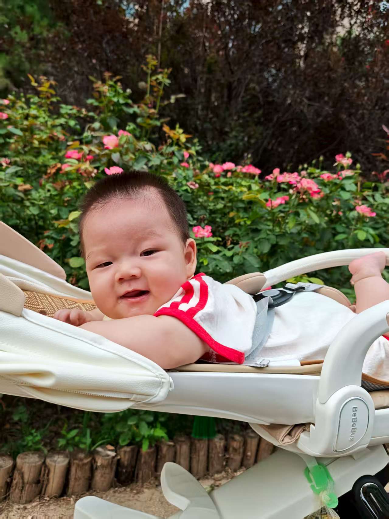 听古典音乐,听节奏感音乐大动作方面今天趴卧时间比较多,出门在外面玩趴在推车上,地垫上,在家里翻身,健身操等。