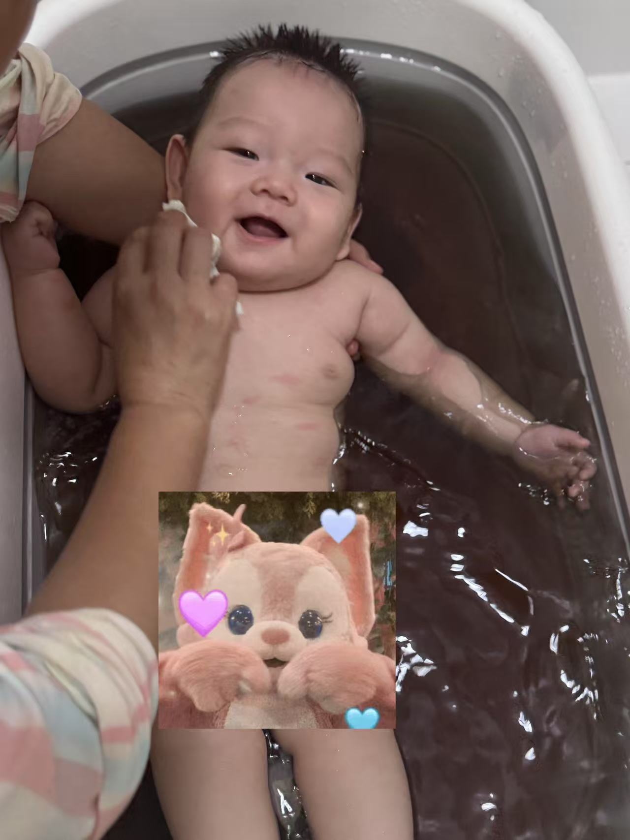 洗浴时感知水声,棉柔巾擦身体的触觉,今天用的艾叶水,黑黑的,宝宝还是很开心,没有排斥。