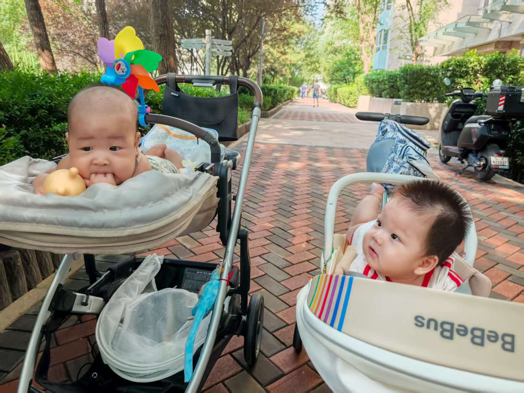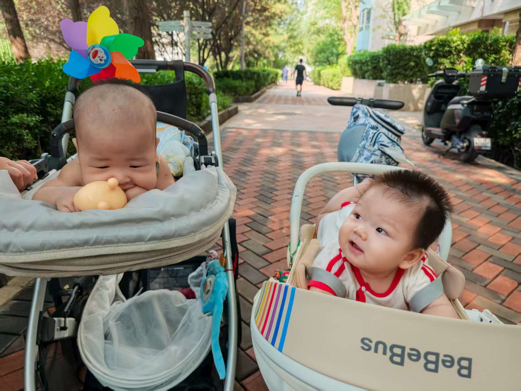 傍晚时分,舅妈和妈妈带宝宝在小区散步,舅妈推着宝宝,妈妈给宝宝扇着扇子,宝宝由开始的躺着到趴着,一路东看看西瞧瞧,啃着牙胶,听着儿歌,听着妈妈和舅妈边走边交谈,时而妈妈和舅妈的笑声传入耳中,引得宝宝发出嗷嗷的叫声,也想加入他们的谈话中呢。