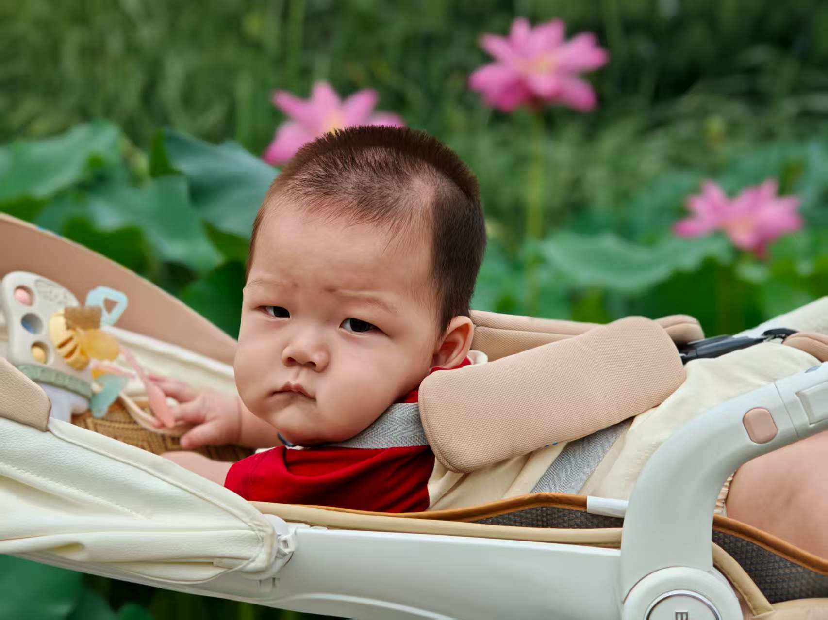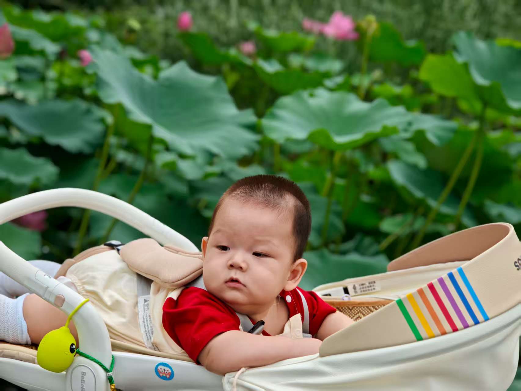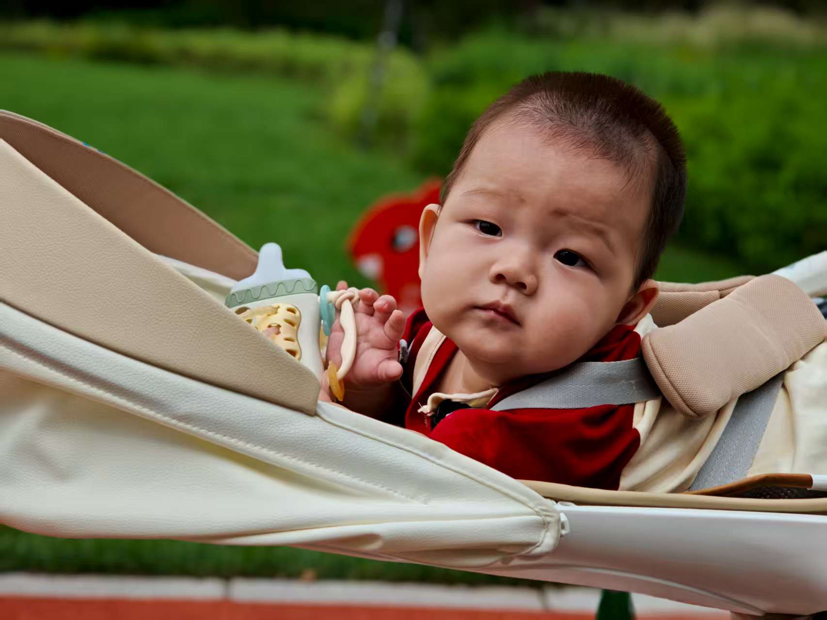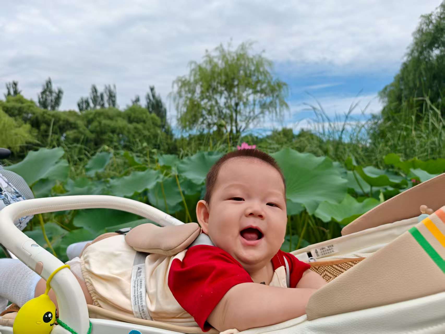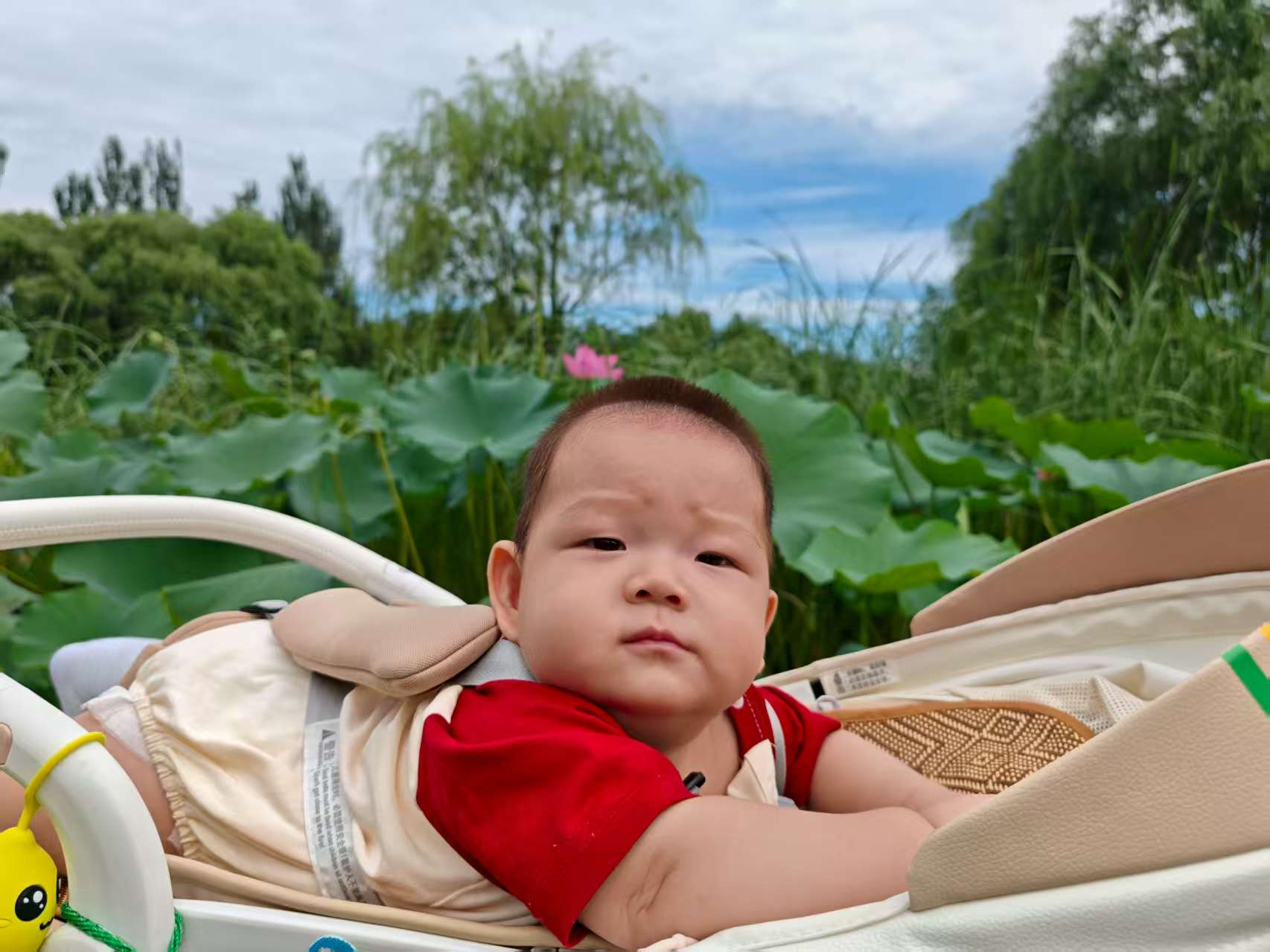 舅妈推着宝宝,宝宝躺在婴儿车里,听着浩然甜甜的声音,伴着车子轱辘转动的沙沙声,穿过一道道弯弯曲曲的小路,一排排错落有致的松柏离宝宝好近好近,听舅妈说,宝贝,要下雨了,快回家,正说着,宝宝脸上腿上就有了凉意,哈哈,下雨啦,快回家。