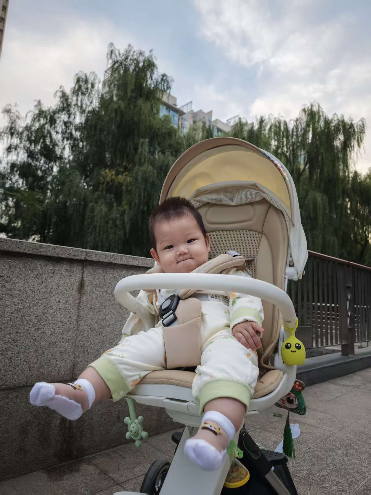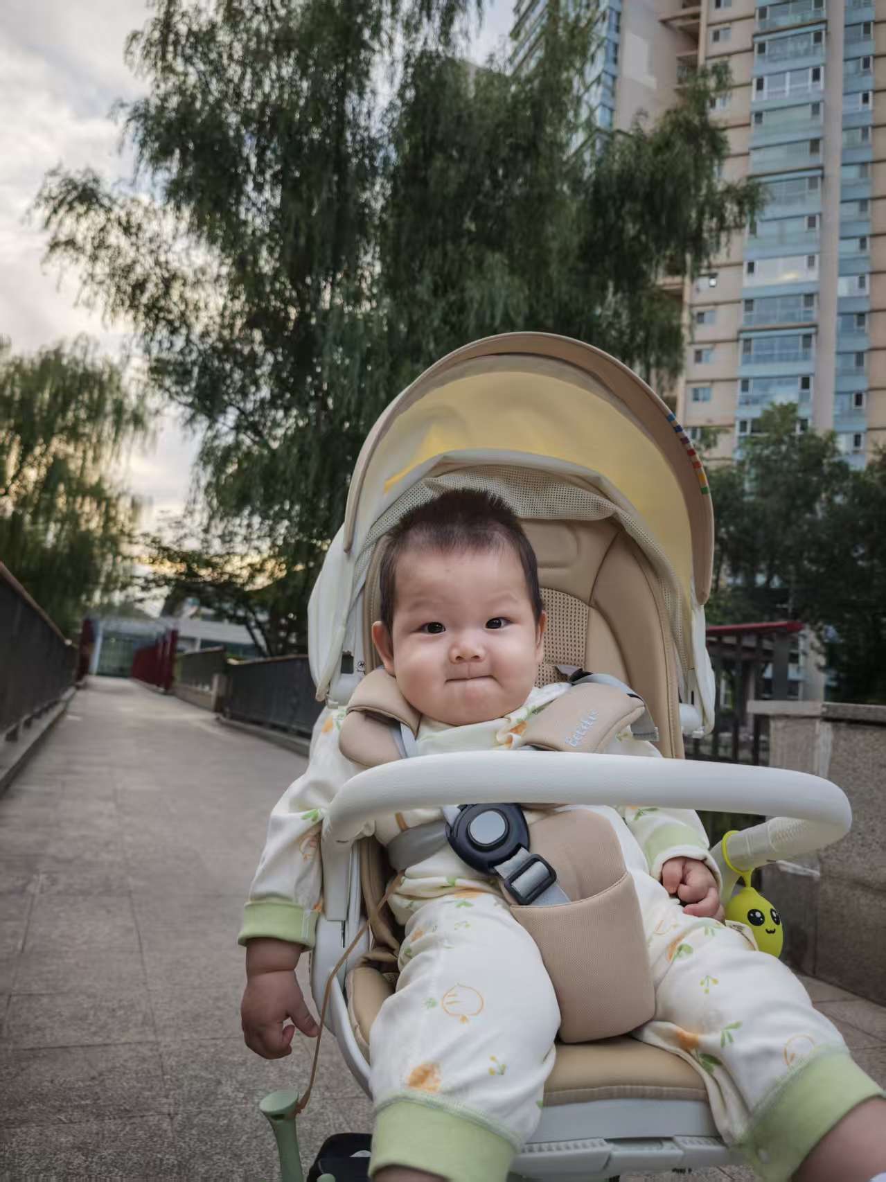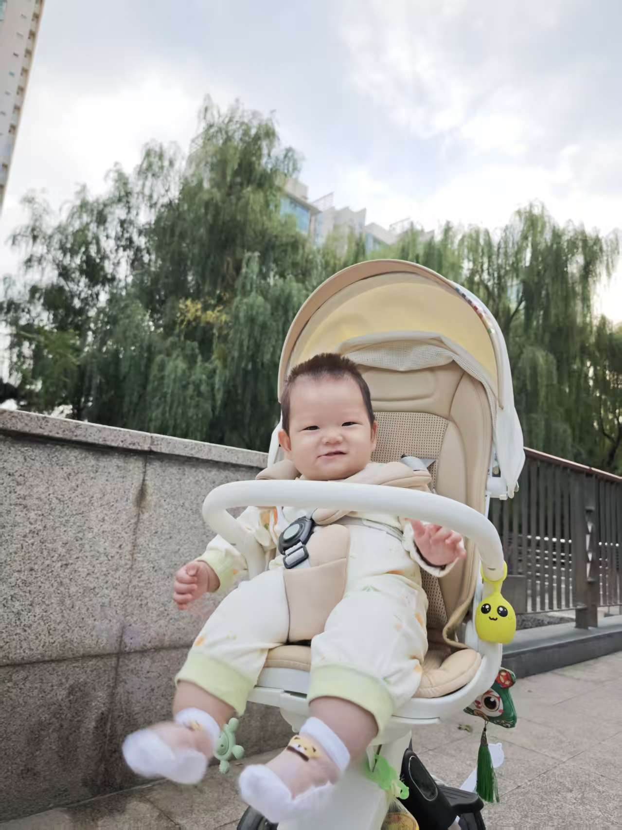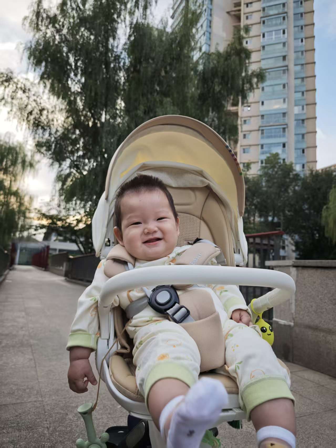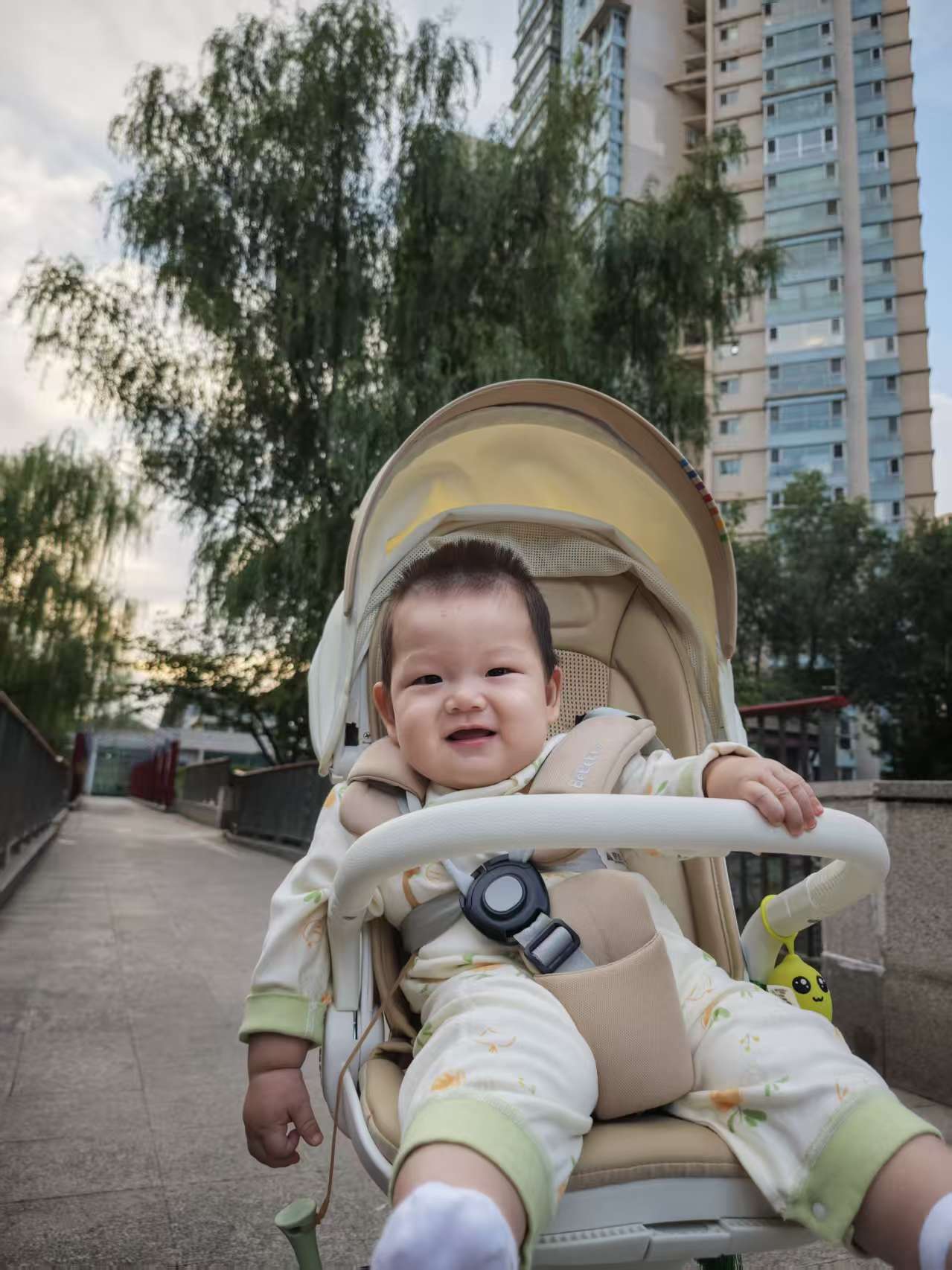 在外面散步,有人打招呼,宝宝都会笑一笑,情商在线哦。