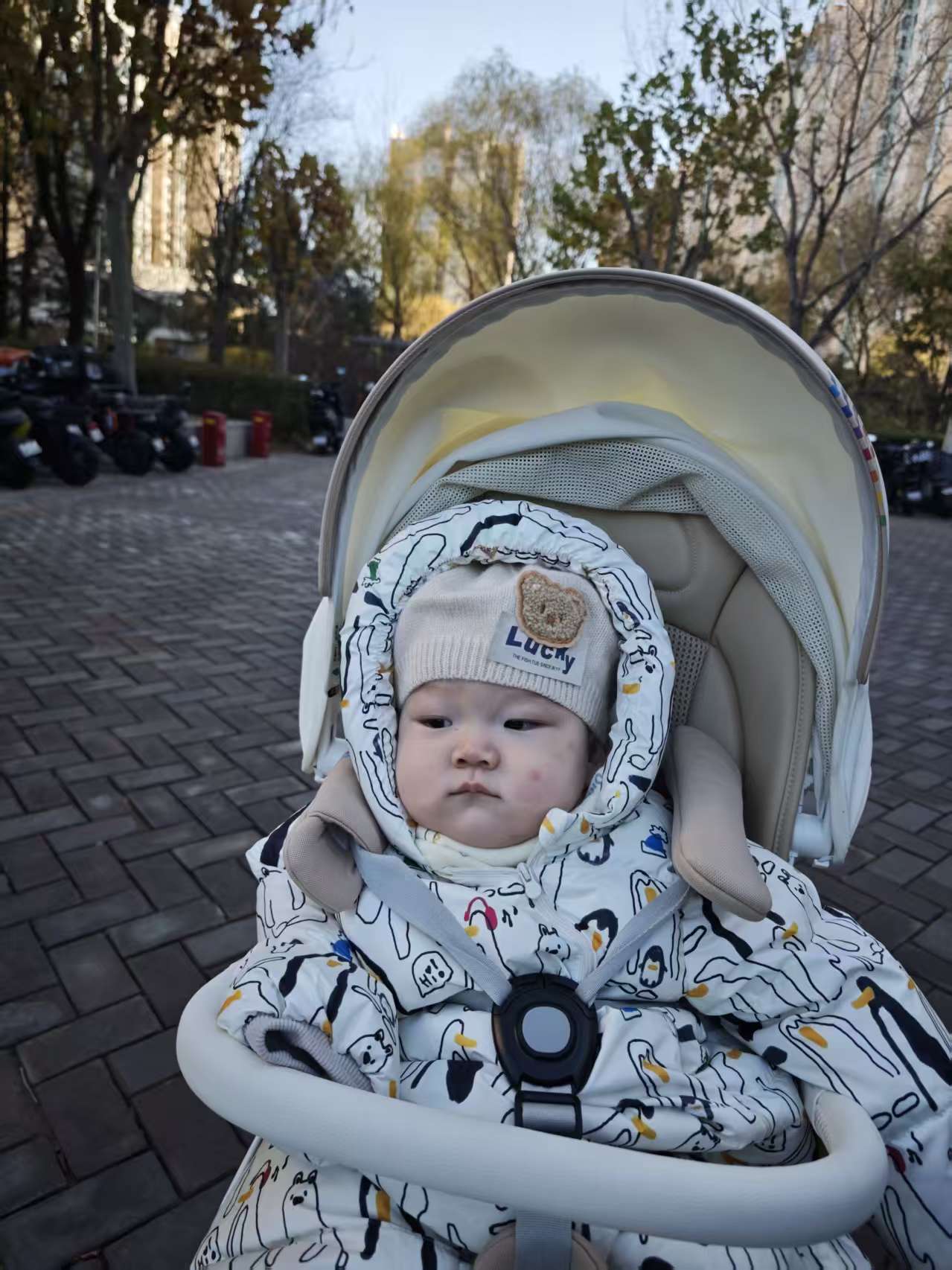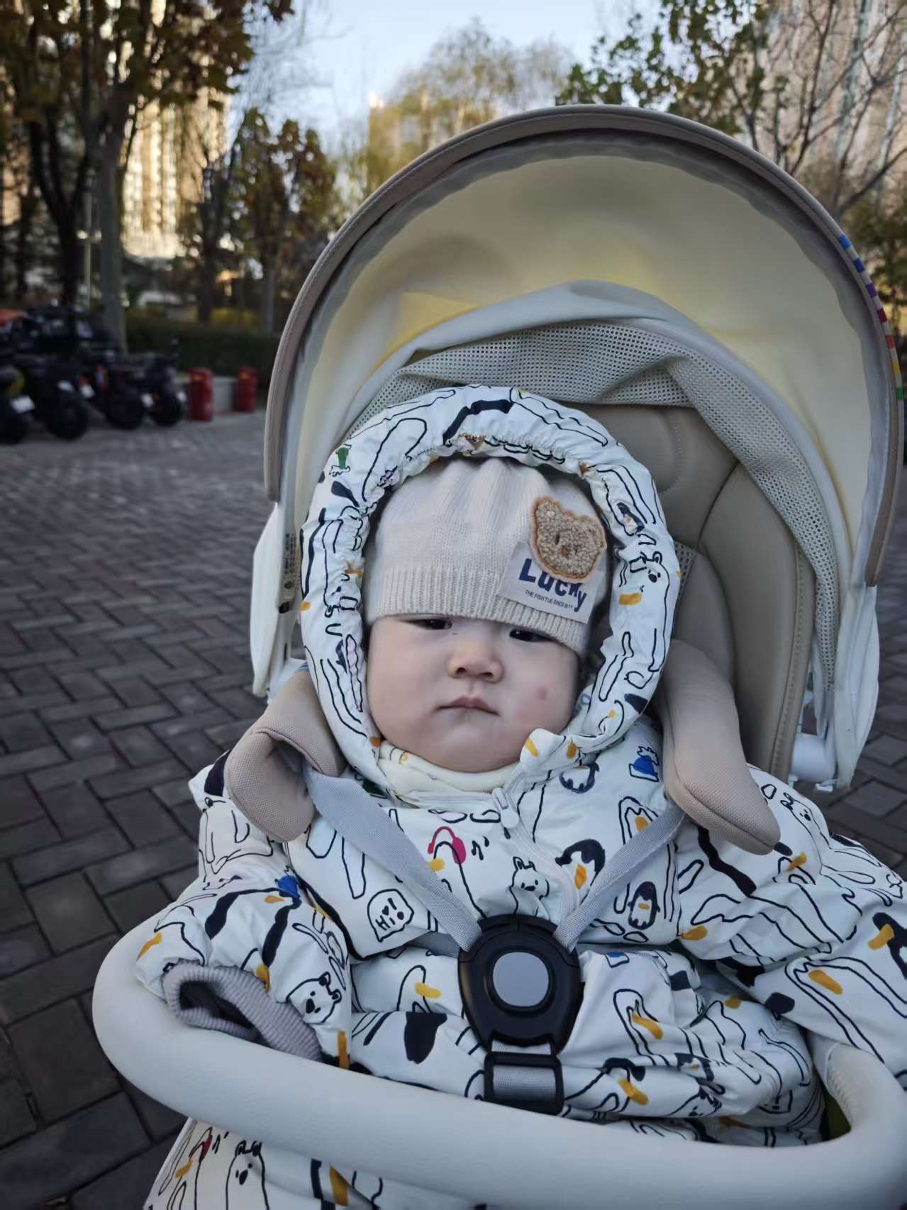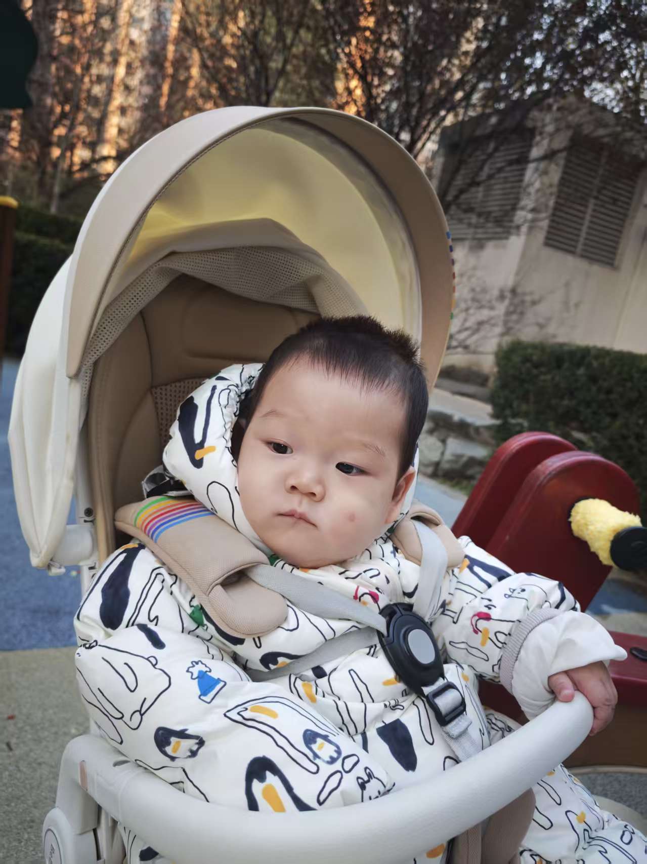 上午爷爷的大手牵着我的小车车,"哒哒哒"带我出门。哇——外面像开派对一样!好多小朋友都在晒太阳,我挥着小手和他们"啊啊"打招呼,大家都被我的新造型帅到啦!