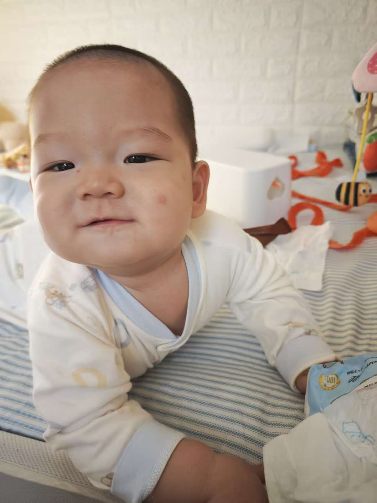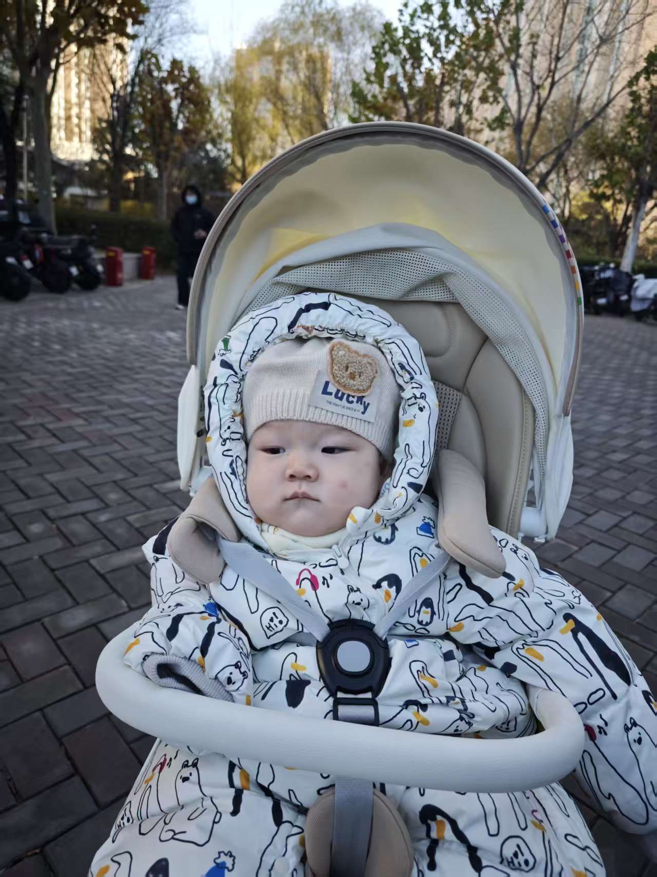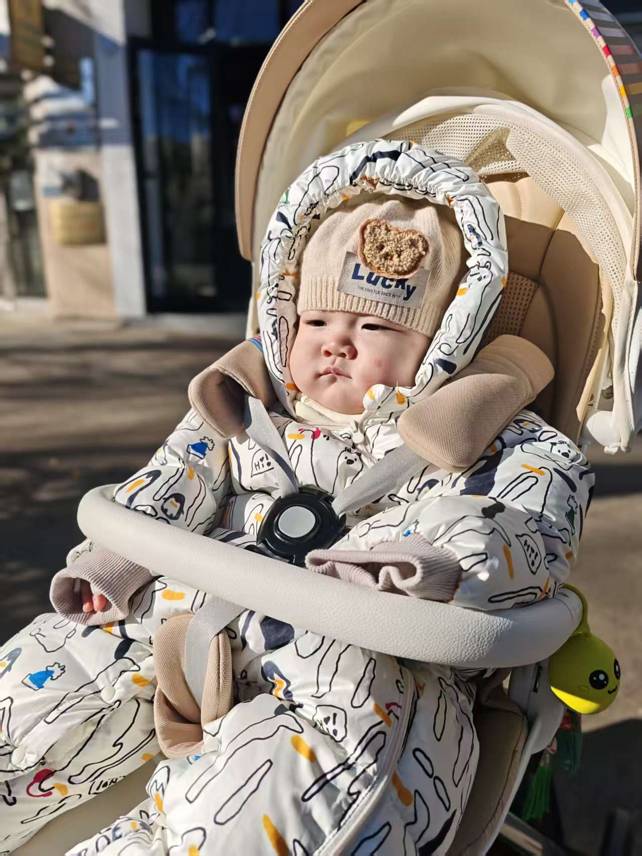 上午爷爷的大手牵着我的小车车,"哒哒哒"带我出门。哇——外面像开派对一样!好多小朋友都在晒太阳,我挥着小手和他们"啊啊"打招呼,大家都被我的新造型帅到啦!
