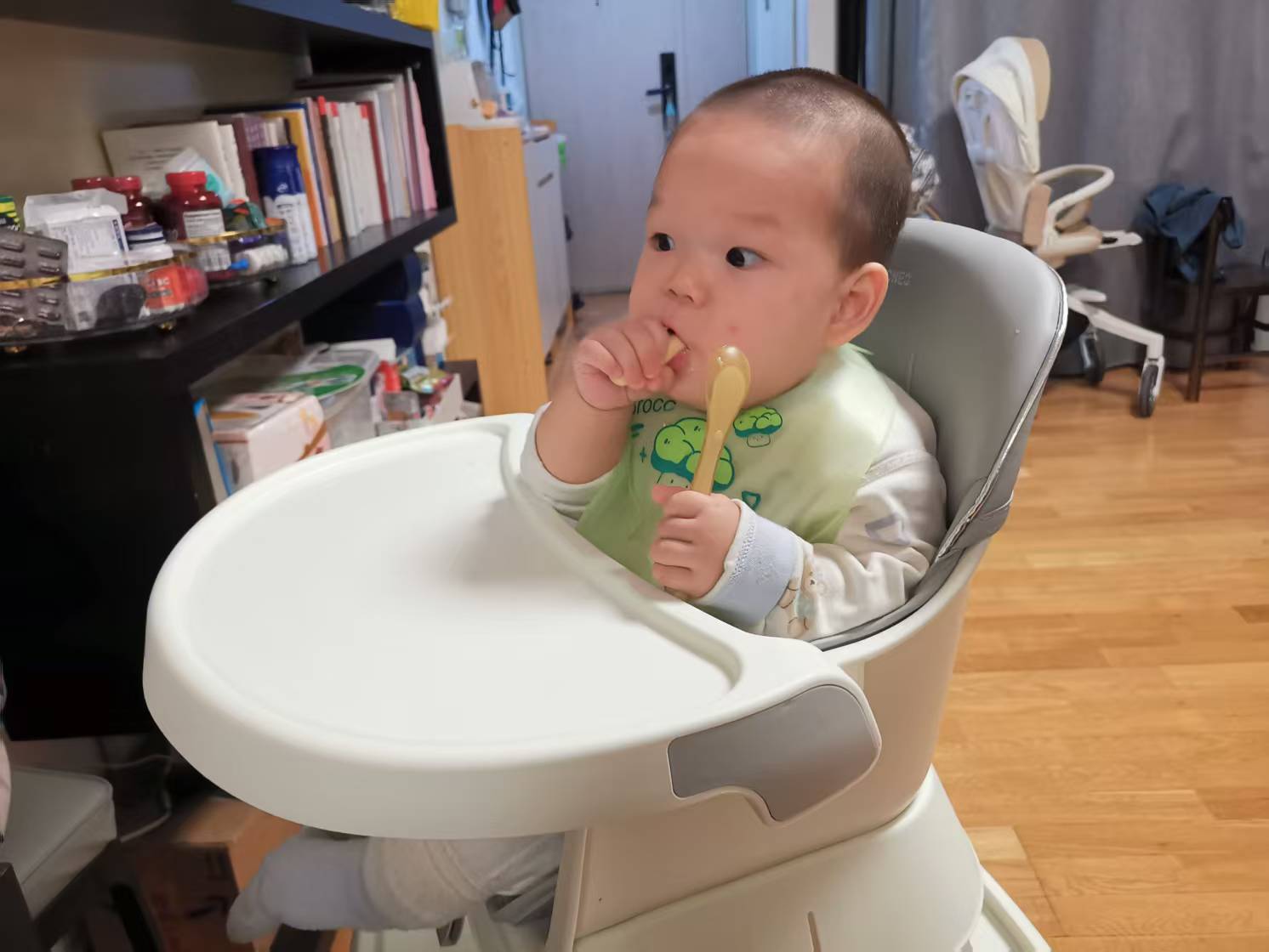 11:25 吃辅食小米肉菜粥小米 15 克 + 80 克水 + 鸡肉泥 + 南瓜泥 + 菠菜碎 + 核桃油吃得很好,都吃完了。