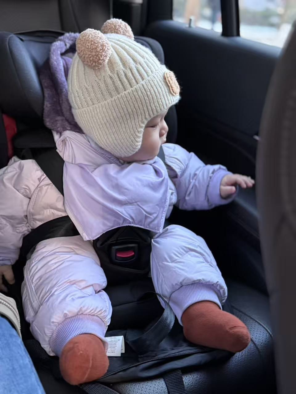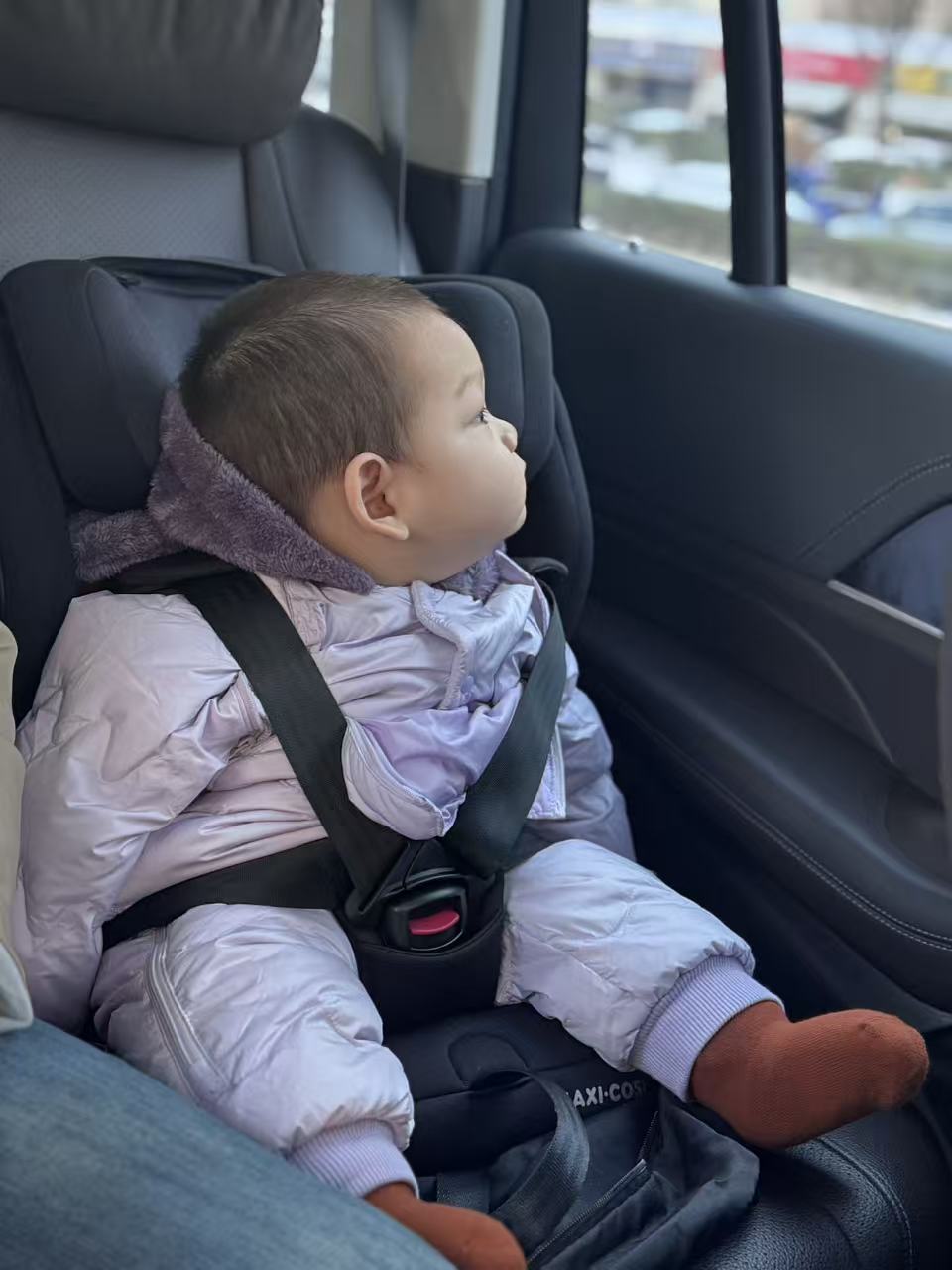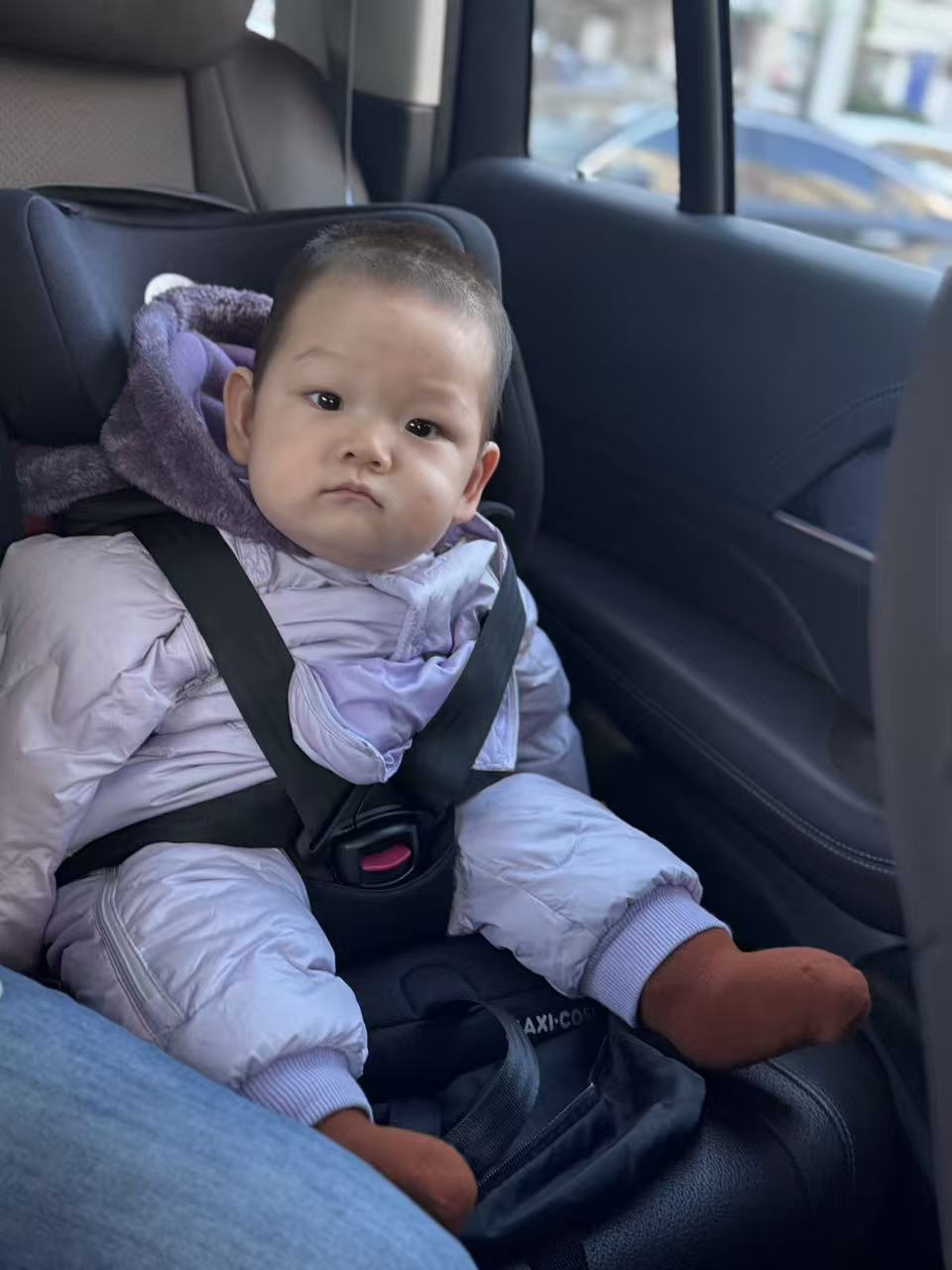 在陌生环境中不太愿意睡觉,回来路上在车上又睡着了,舅妈细心拖住小脑袋。