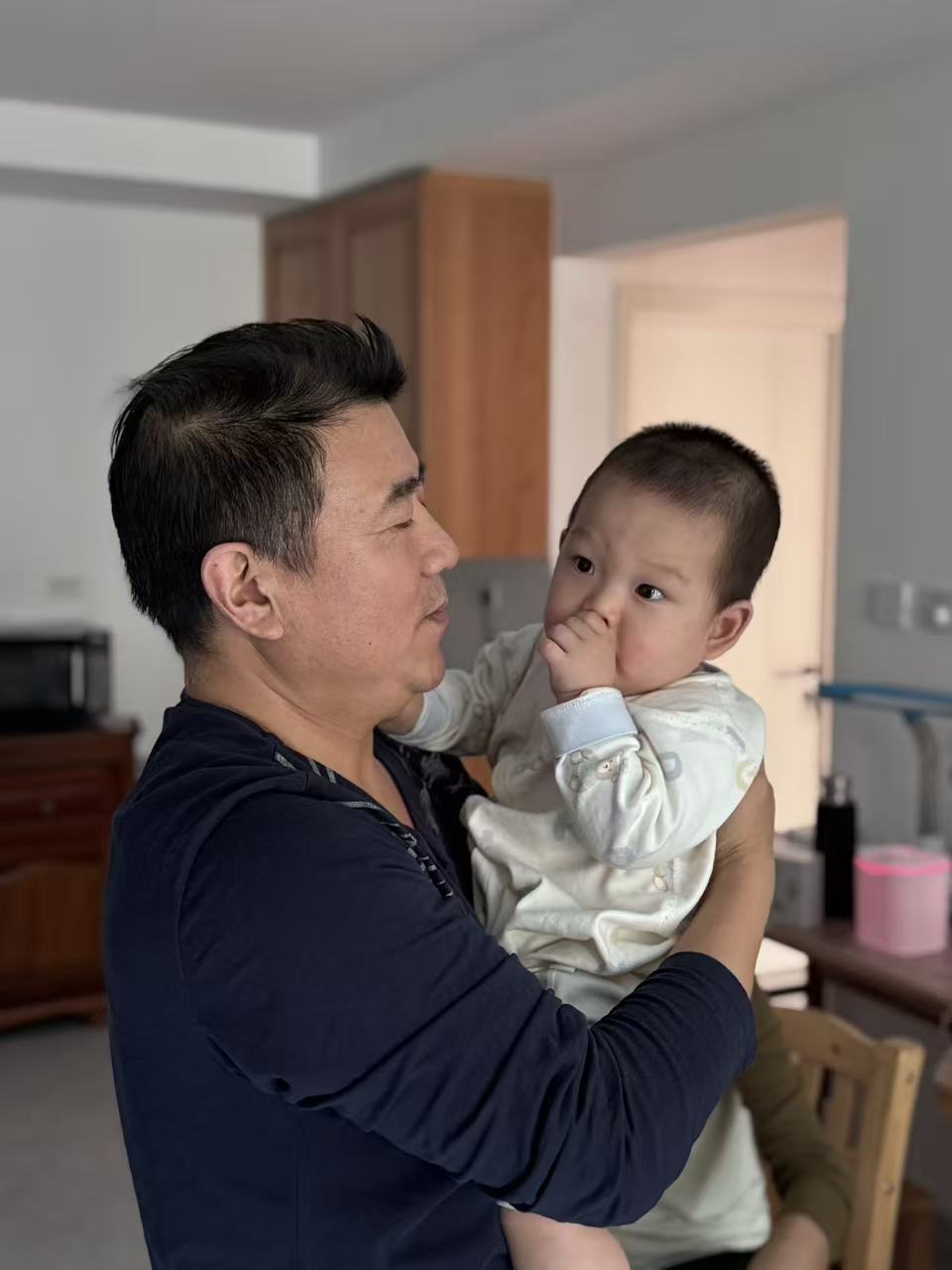 【情绪】娃看到高大的成年男性和自己互动会有防备性哭泣,和家人也不例外,但是一起沟通熟悉半小时不到,就会开心互动和笑。带宝宝多社交和互动,接触不同的人和事物,储备更多容忍度和鲁棒性。
