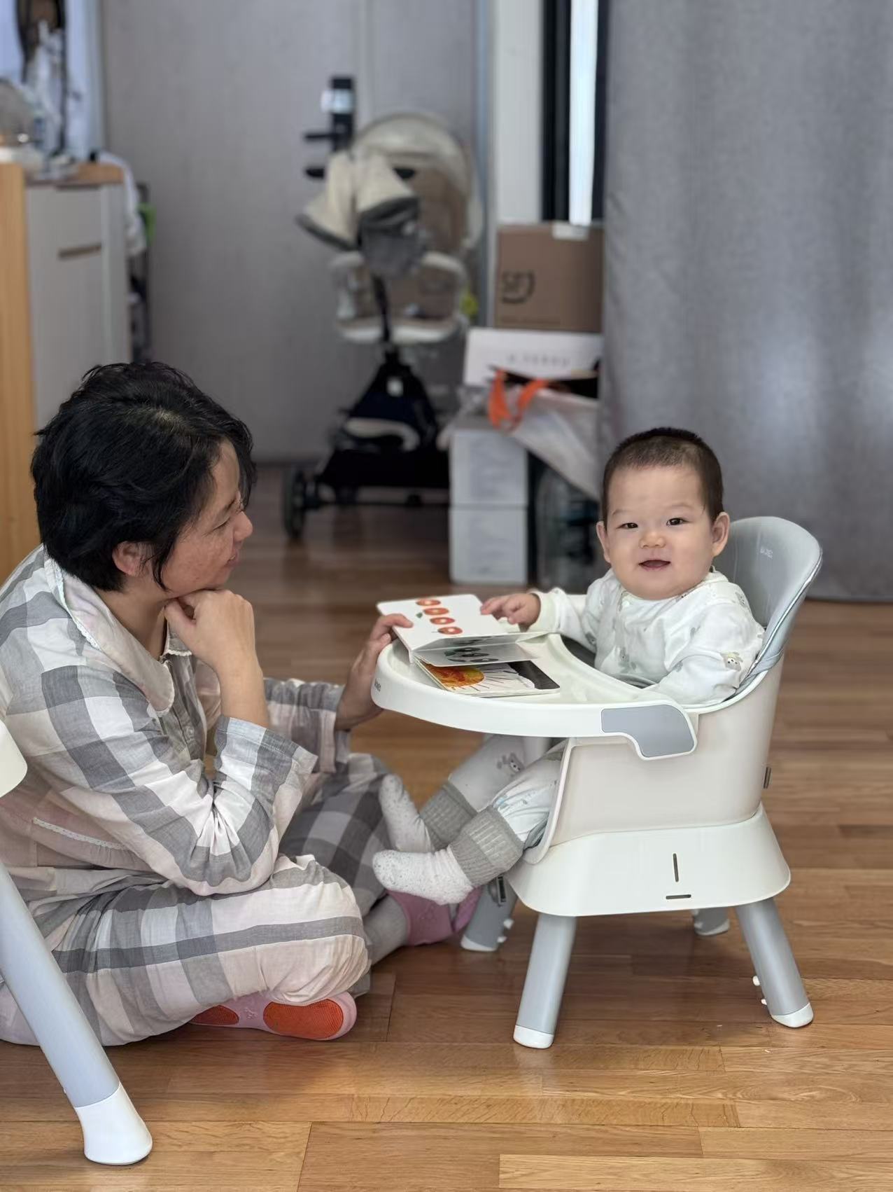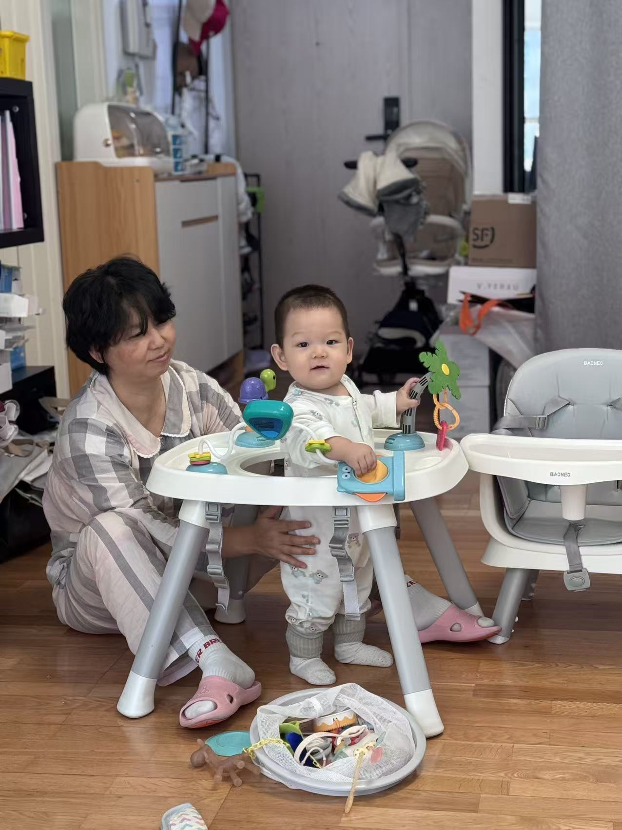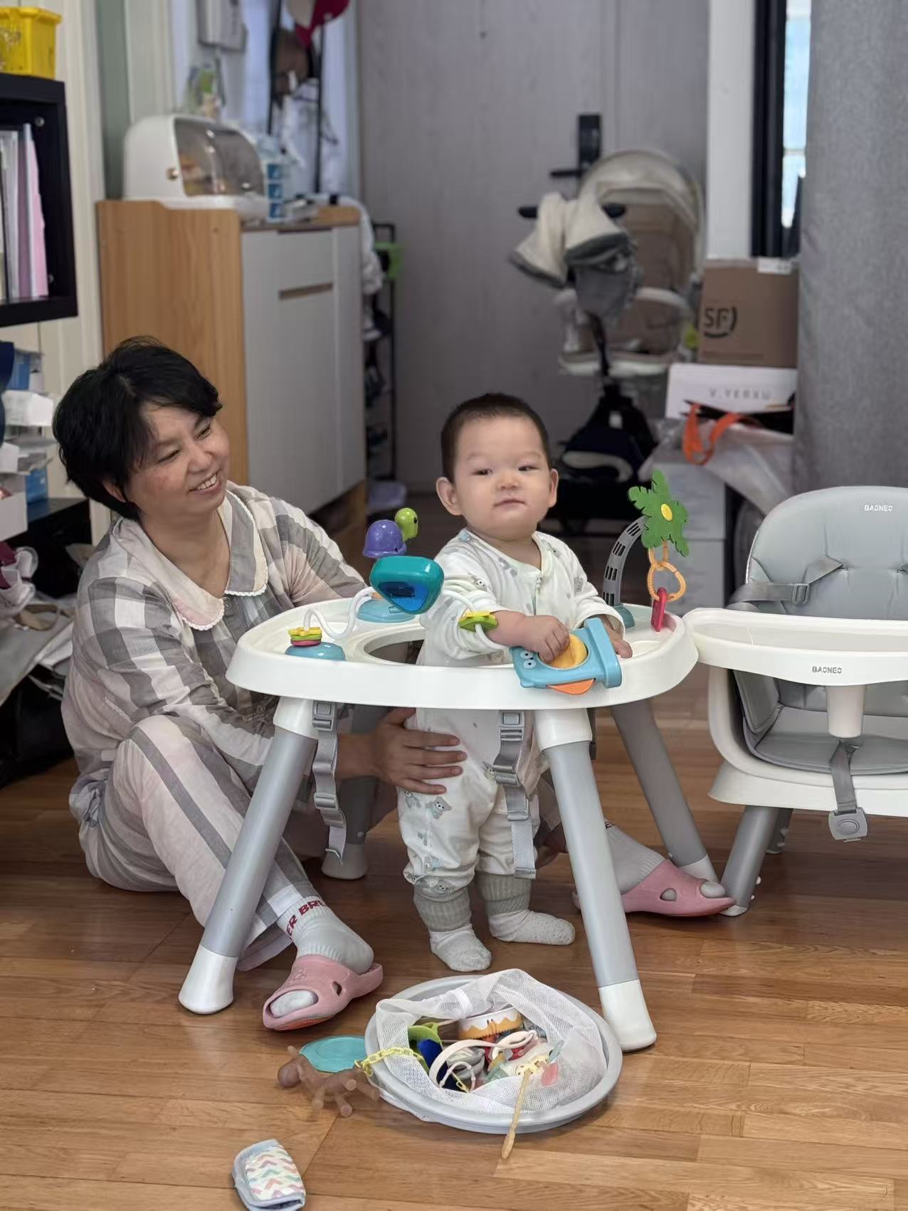 最神奇是餐椅!它忽然变成旋转舞台,舅妈把我放进中间的圆窝窝,周围全是宝藏:会转圈的三角块,一拨就滴答滴答响;绿色叶子一碰哗啦啦转,像在刮风!还有小乌龟,我用牙齿尝尝(咦,硬硬的)。下一秒,我又坐在软蘑菇似的小凳上,舅妈打开一本书——哇!书里钻出月亮!还有一条胖嘟嘟的毛毛虫,我戳戳它的红脑袋,它居然穿过书页上的洞洞!这和趴着看书不一样,我的脚丫能悬空晃荡,像坐小船。