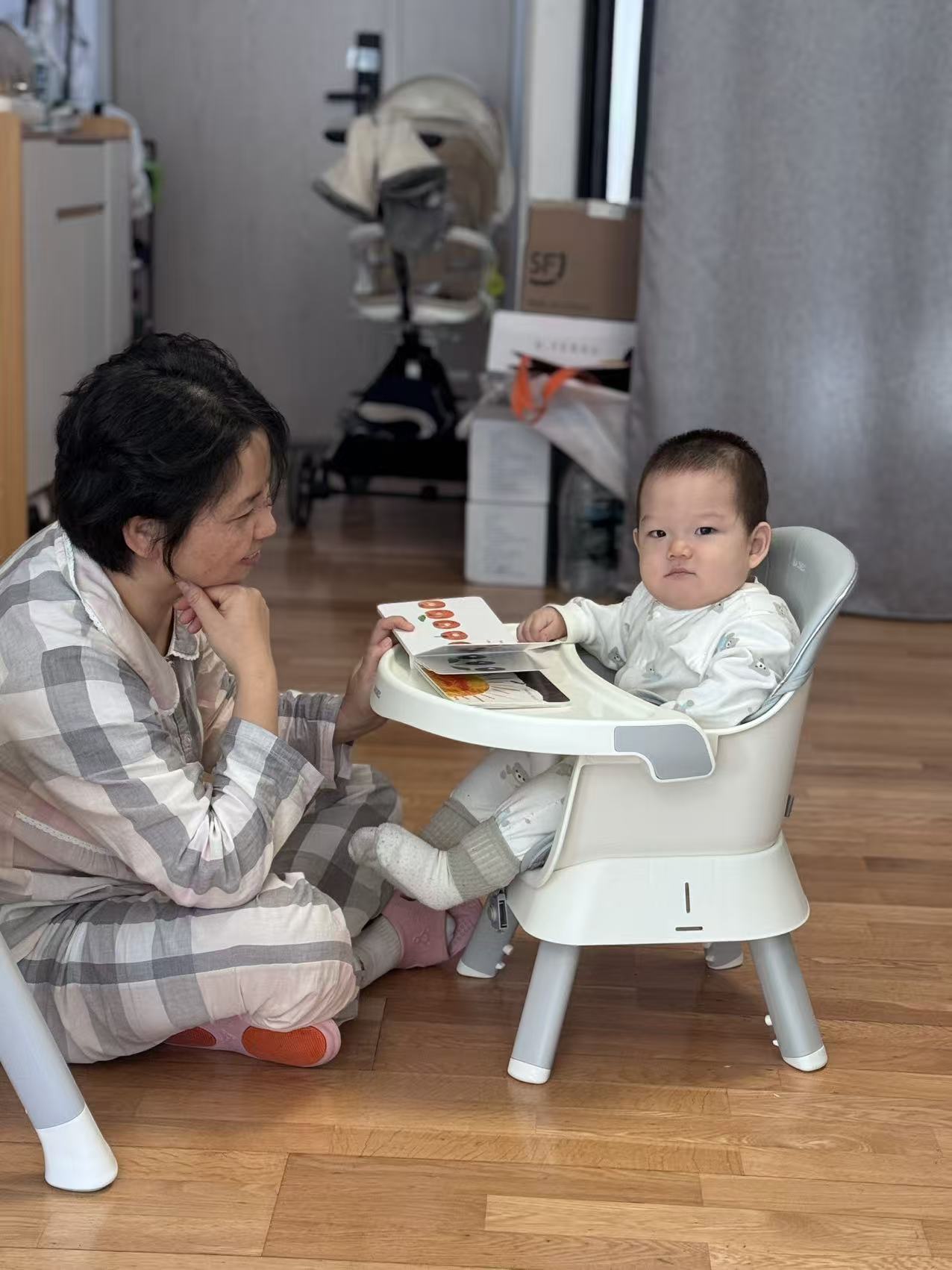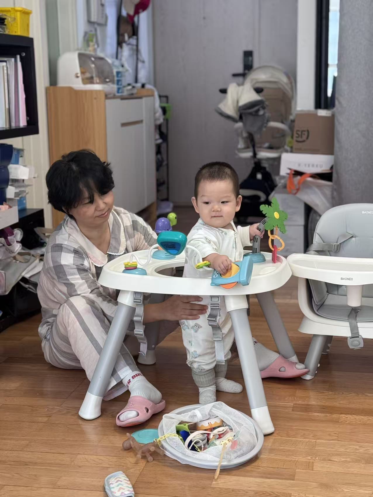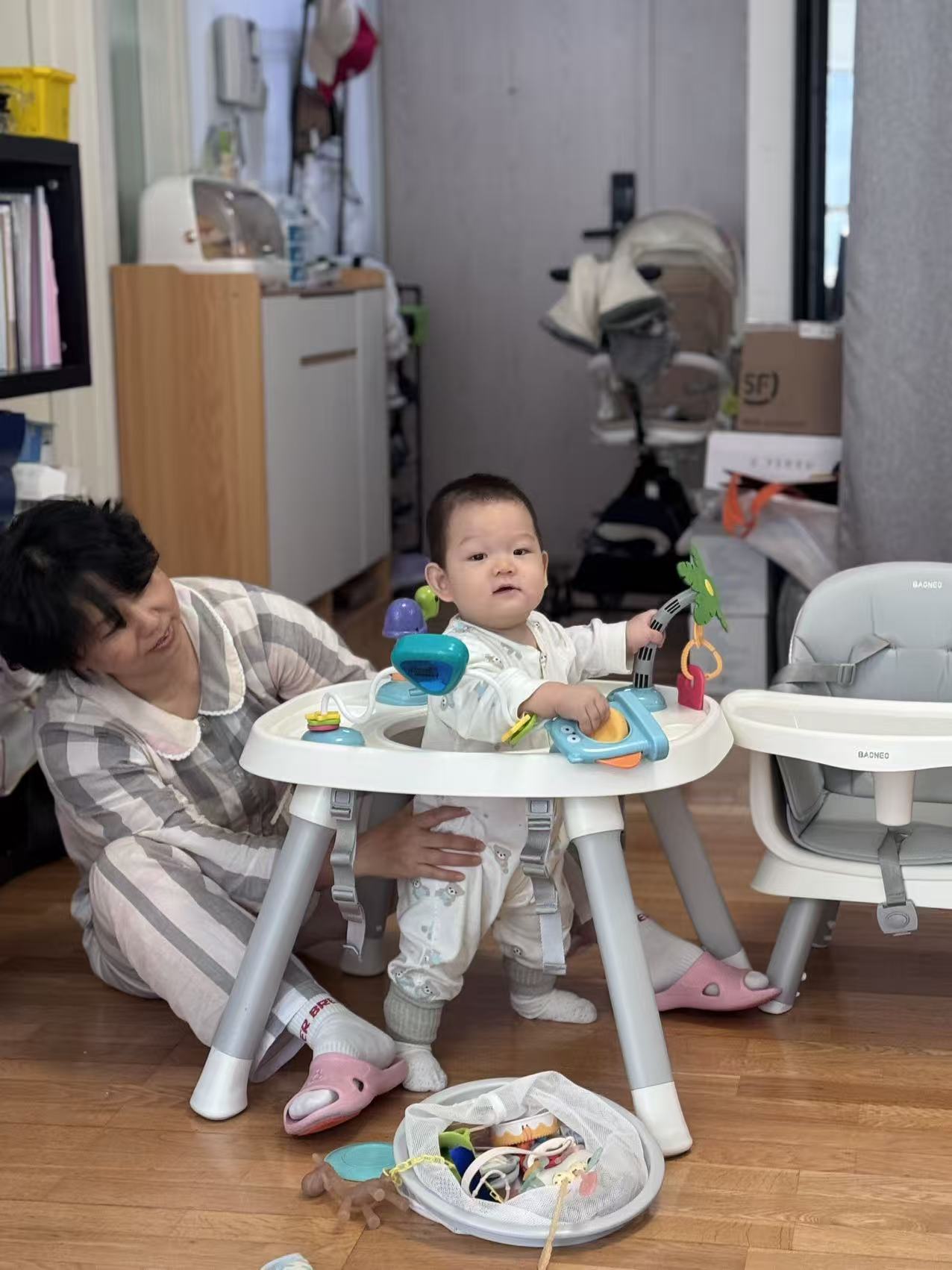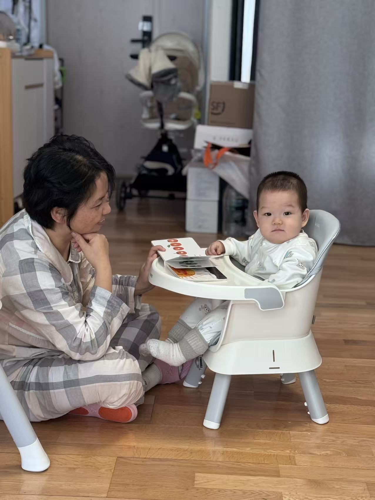 最神奇是餐椅!它忽然变成旋转舞台,舅妈把我放进中间的圆窝窝,周围全是宝藏:会转圈的三角块,一拨就滴答滴答响;绿色叶子一碰哗啦啦转,像在刮风!还有小乌龟,我用牙齿尝尝(咦,硬硬的)。下一秒,我又坐在软蘑菇似的小凳上,舅妈打开一本书——哇!书里钻出月亮!还有一条胖嘟嘟的毛毛虫,我戳戳它的红脑袋,它居然穿过书页上的洞洞!这和趴着看书不一样,我的脚丫能悬空晃荡,像坐小船。