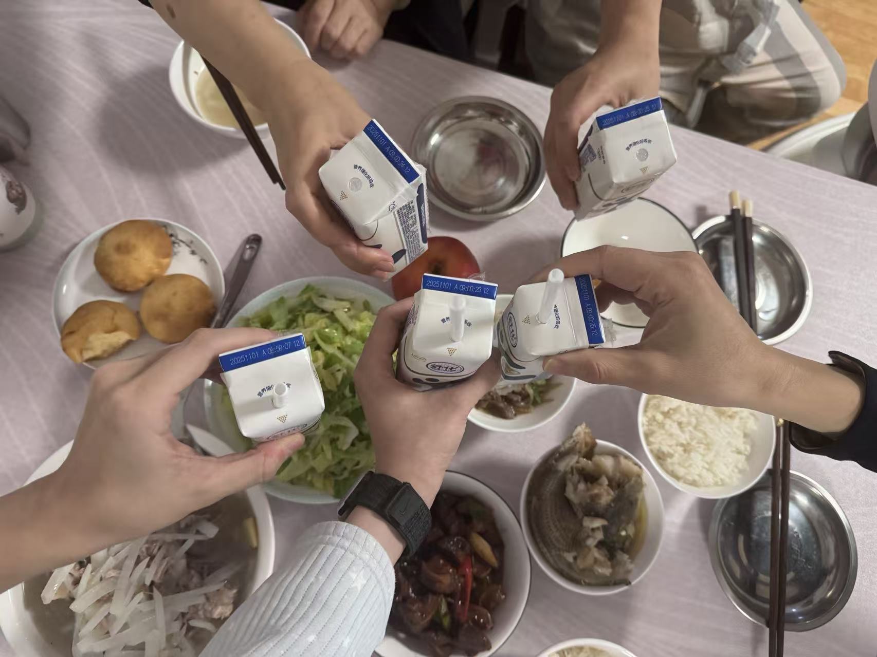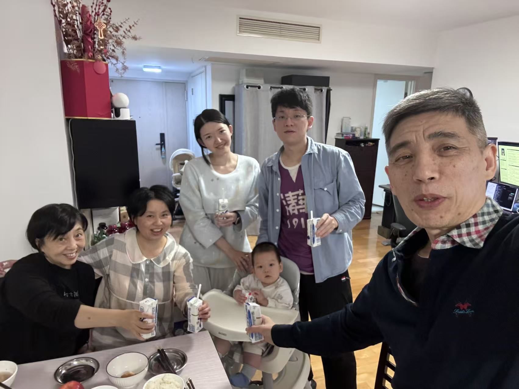 虽然家里没有圣诞树和彩灯,舅妈准备了家常菜,一家人围坐,举杯互道“节日快乐”。宝宝坐在自己的餐椅里,小手紧紧抓着他的牛奶,学着大人的样子,努力举高高,嘴里还“啊~啊~”地喊着,那模样真是可爱极了!当然,也有个小意外—一宝宝一激动,小手一挥,碰洒了妈妈手里的半杯牛奶。妈妈轻呼一声,我们都笑了,赶紧收拾。宝宝睁着圆溜溜的大眼睛看看大家,发现气氛依旧欢乐,自己也跟着“咯咯”笑起来,庆祝一点没受影响。