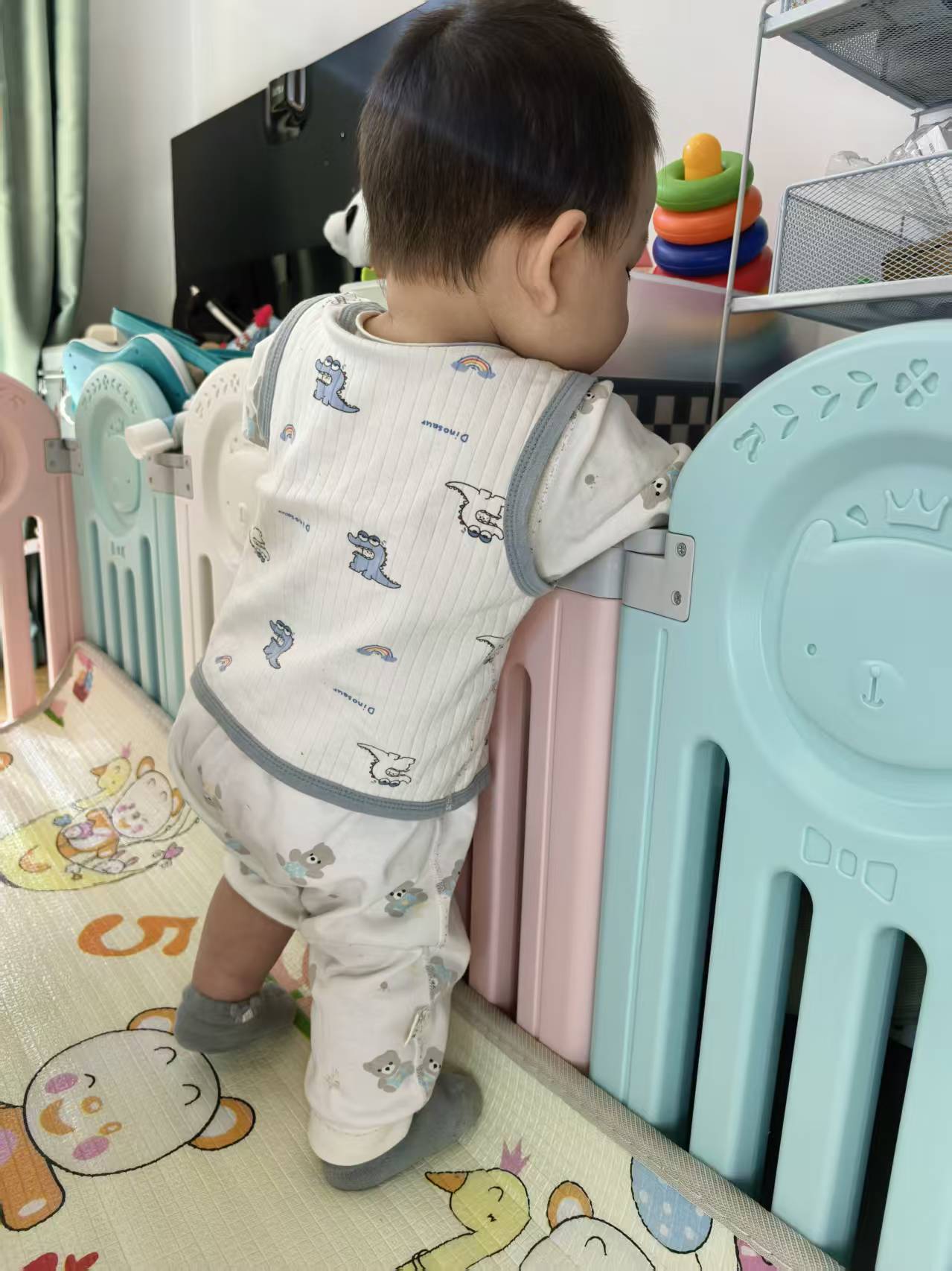 接下来宝宝坐上小汽车,认真研究开门、关门的动作,俨然一副小车模的专注模样。他还喜欢观察其他小朋友:有的推着小车走来走去,有的在蹦床上跳跃,还有的从滑梯上"咻——"地滑下来。宝宝安静看着,像个小观察家,其实小脑袋里说不定正跃跃欲试呢!