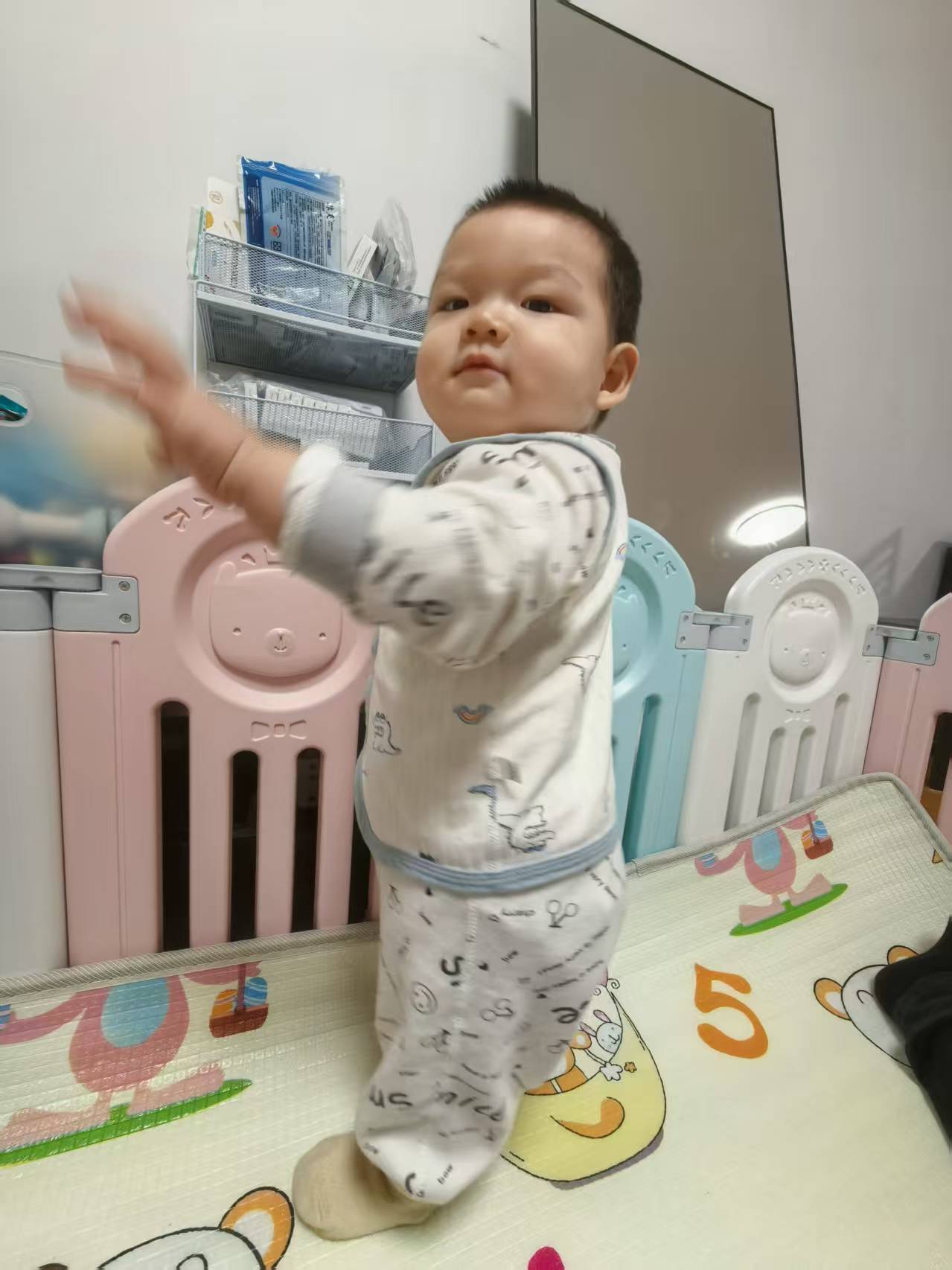 下午乘电梯时遇到一位邻居哥哥,我们出电梯时,宝宝居然主动朝哥哥挥手再见,把哥哥逗得直笑。
