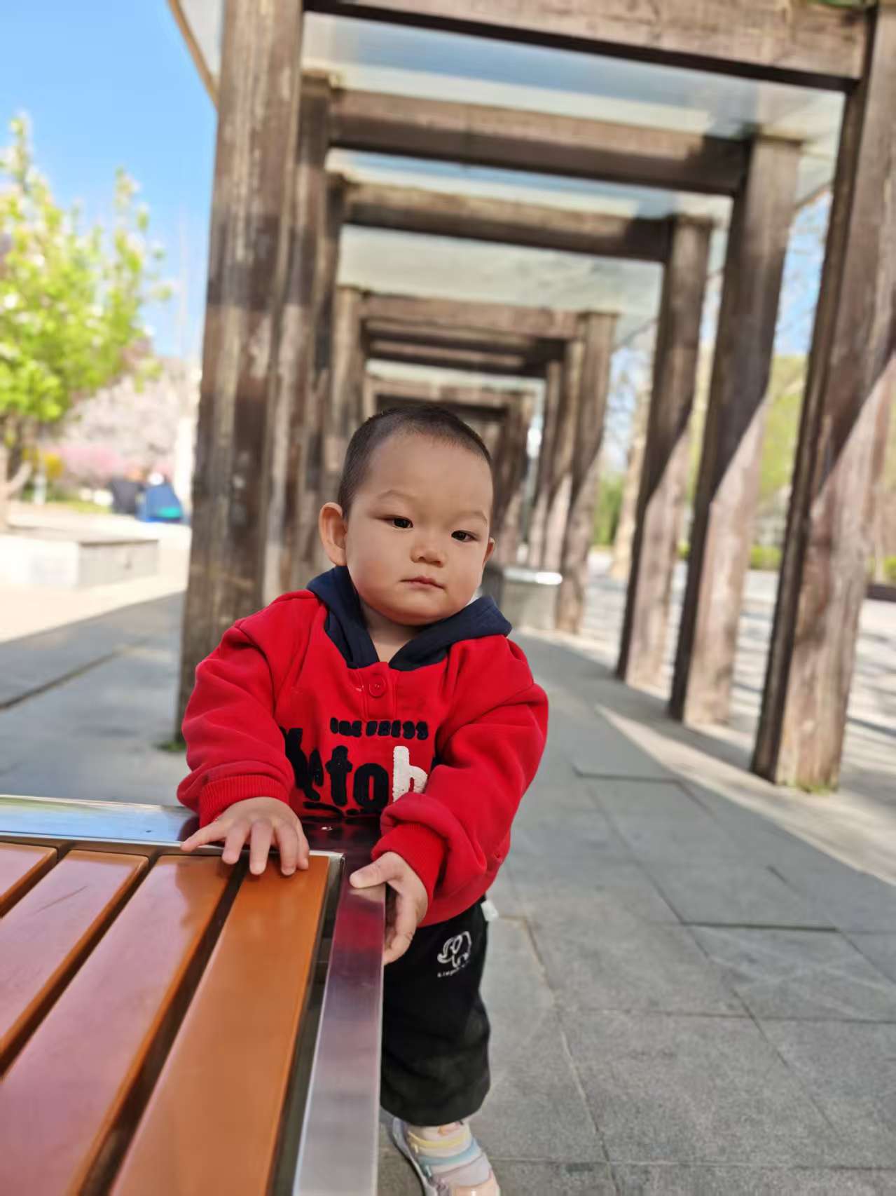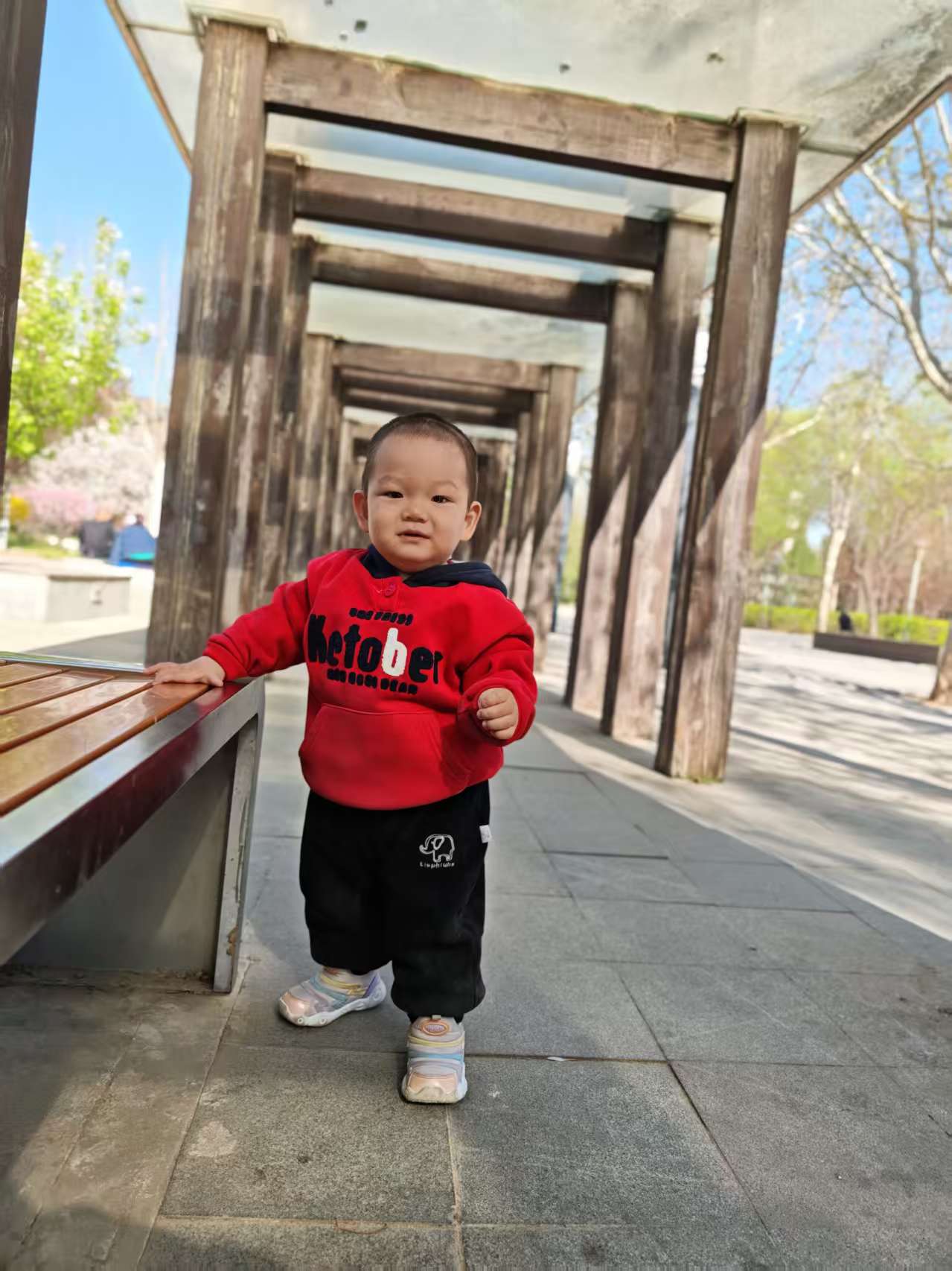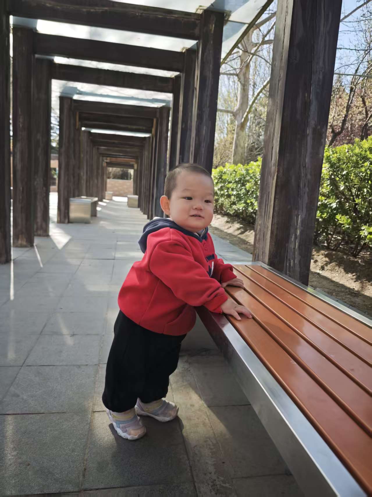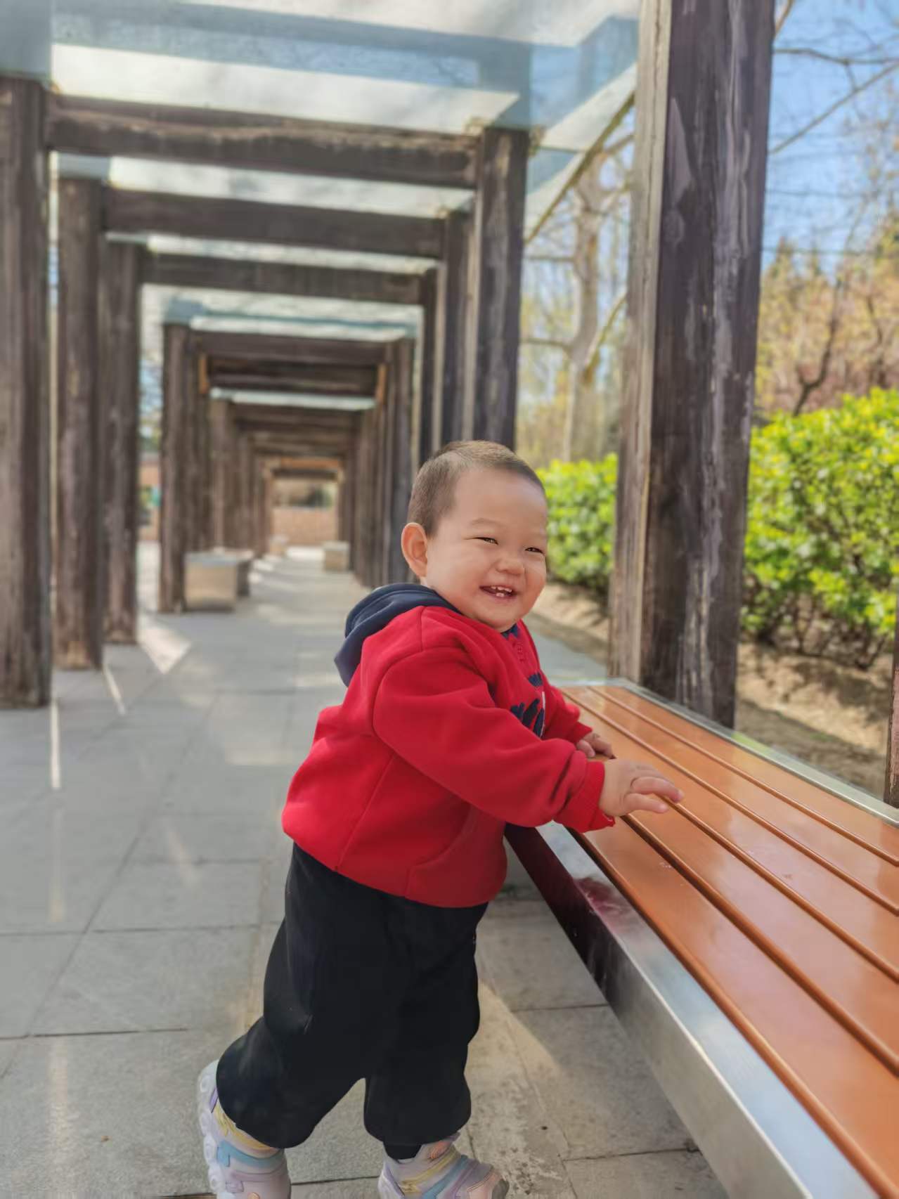 在长廊下玩耍的时候还发生了特别有趣的事,宝宝自己玩着玩着,一扭头看到远处有两位奶奶在晒太阳,立马热情地挥着小手打招呼,奶奶们也特别温柔,立马跟宝宝互动起来,宝宝躲在柱子后面,一会儿探个小脑袋,一会儿又缩回去,跟奶奶们玩躲猫猫,一来一回,笑得停不下来,画面温馨又好玩。