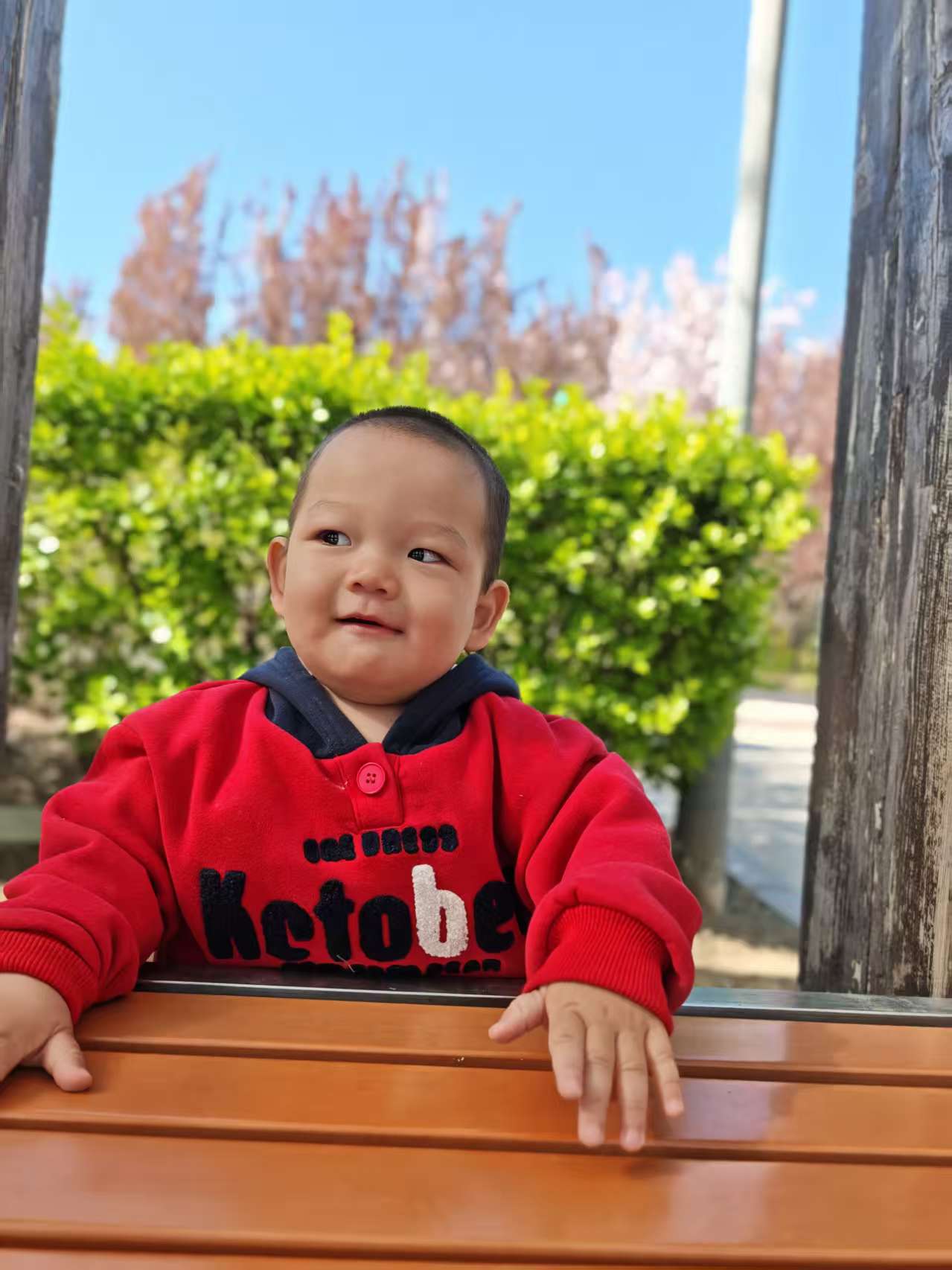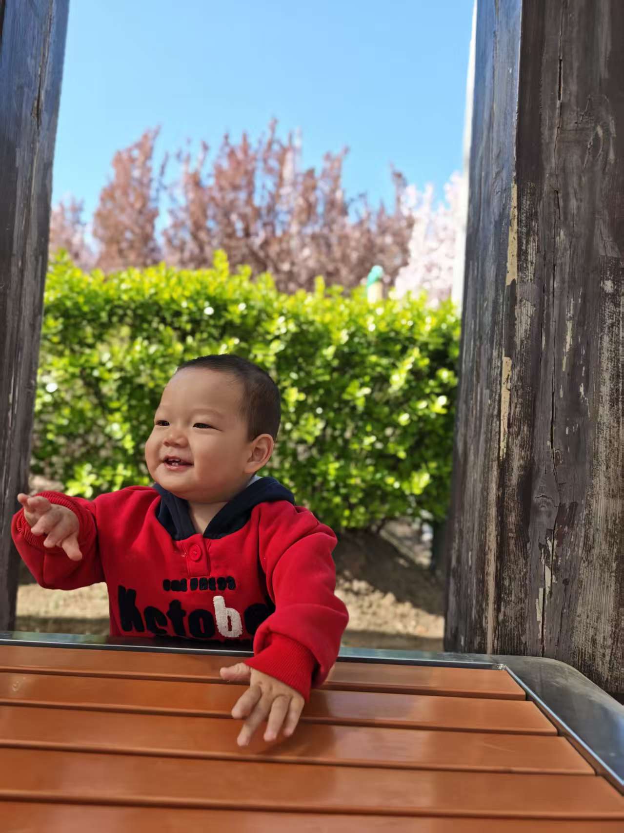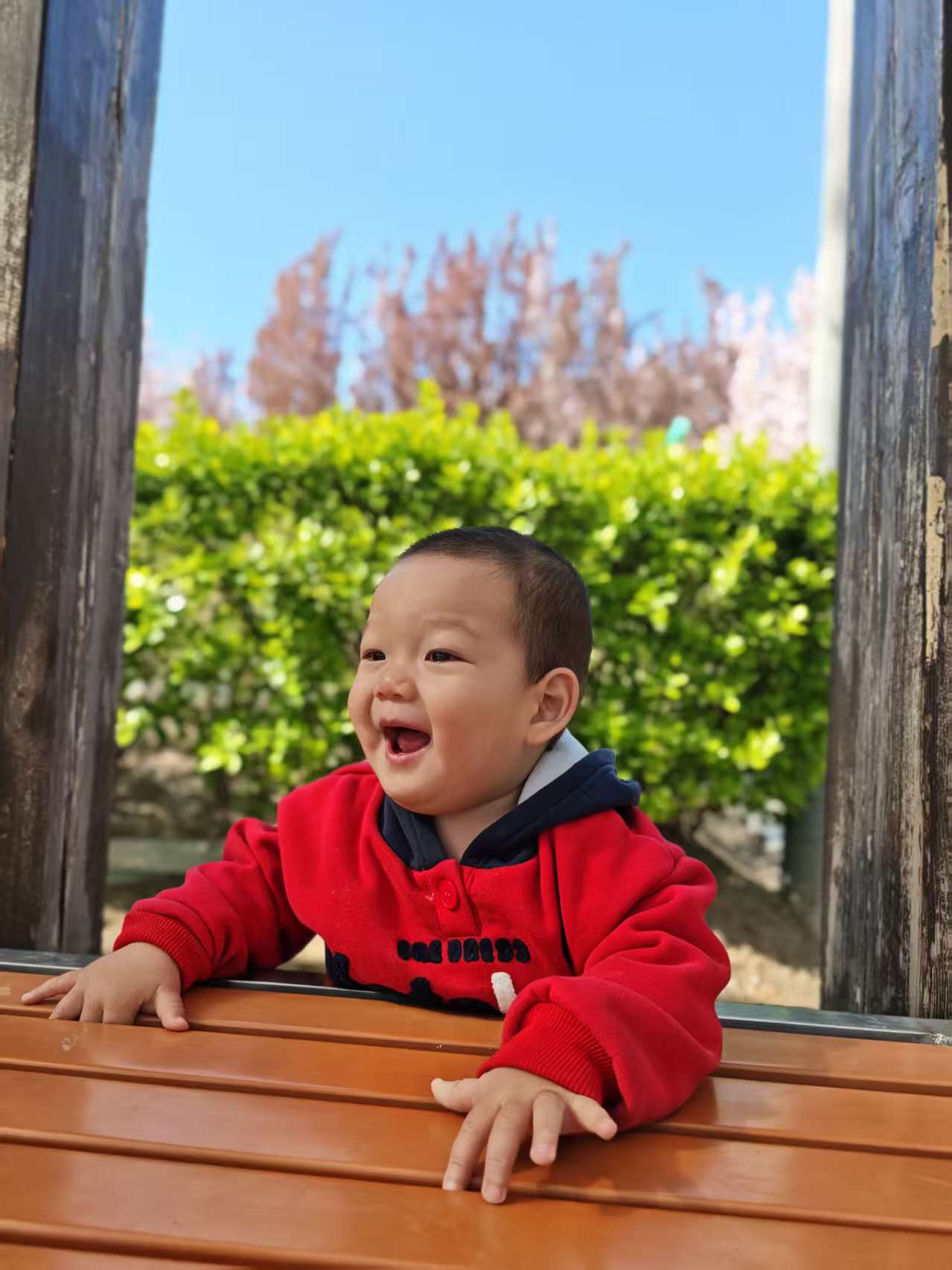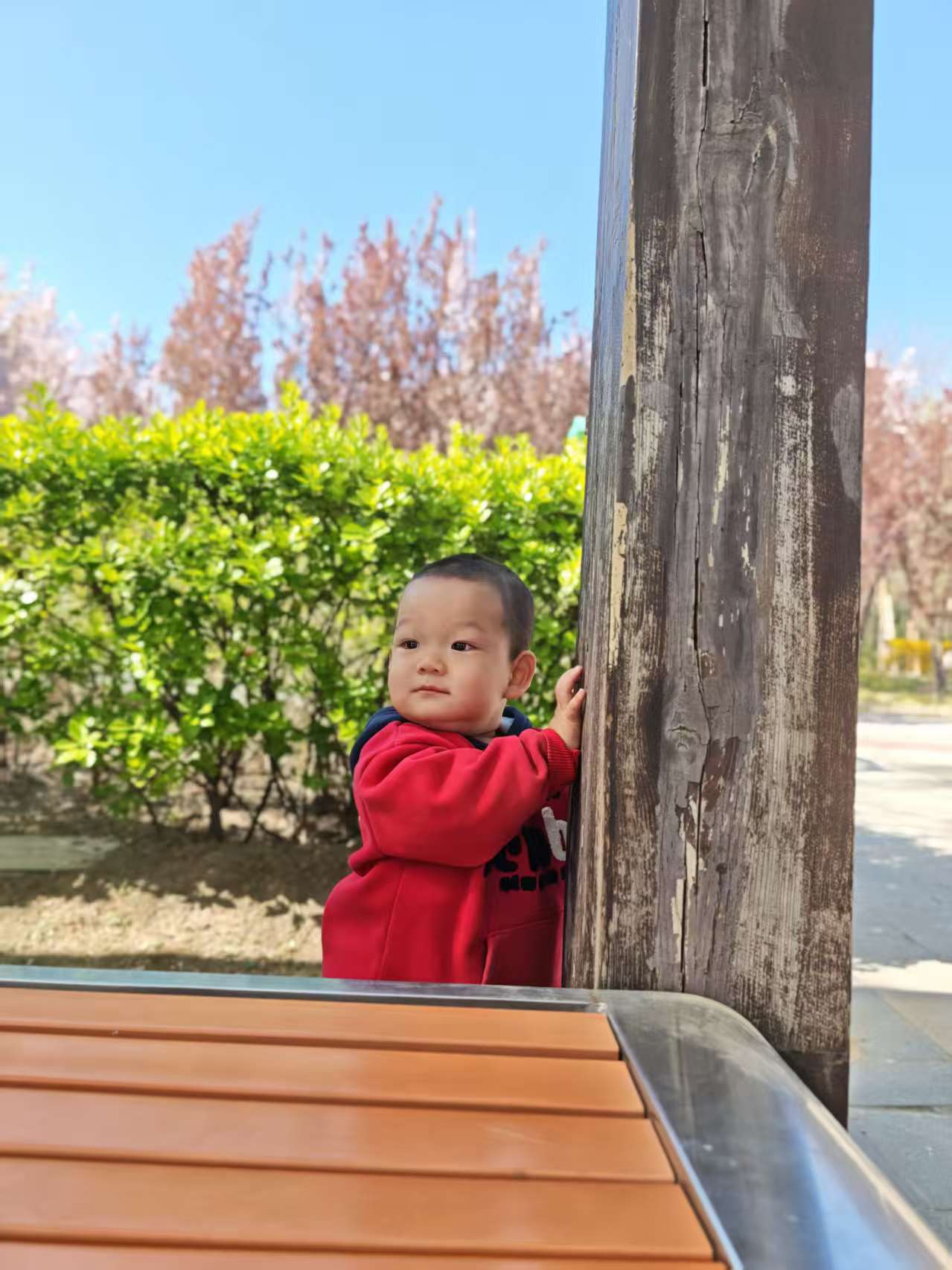 在长廊下玩耍的时候还发生了特别有趣的事,宝宝自己玩着玩着,一扭头看到远处有两位奶奶在晒太阳,立马热情地挥着小手打招呼,奶奶们也特别温柔,立马跟宝宝互动起来,宝宝躲在柱子后面,一会儿探个小脑袋,一会儿又缩回去,跟奶奶们玩躲猫猫,一来一回,笑得停不下来,画面温馨又好玩。