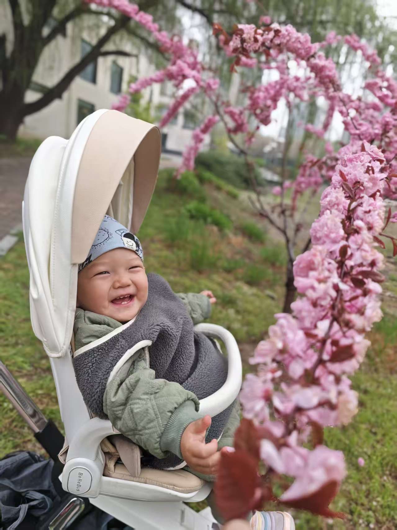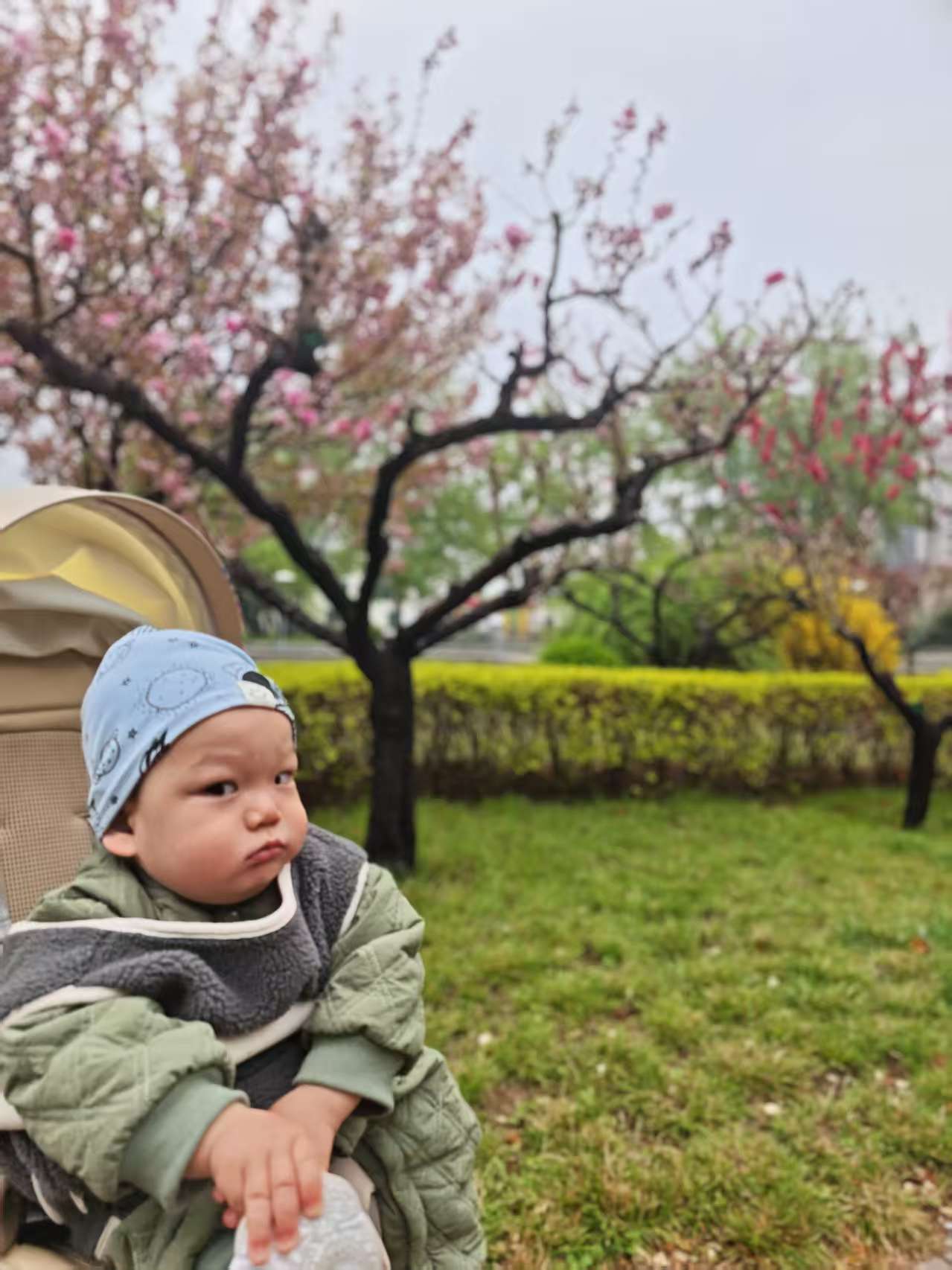 后来到小广场看舞龙,一位奶奶手里的红底金边彩绸舞得特别灵动,绸带在空中划出圆圆的圆弧,像一团跃动的火焰,把春日的活力衬得更足了。宝贝站在我身边,仰着小脑袋看得目不转睛,小嘴巴张成小O形,好像在惊叹“好厉害呀!”。广场上的音乐响起来,宝贝在草地上走来走去,一会儿走两步,一会儿又折回头去闻花香,小短腿跑得稳稳当当,整个人都浸在春日的快乐里。